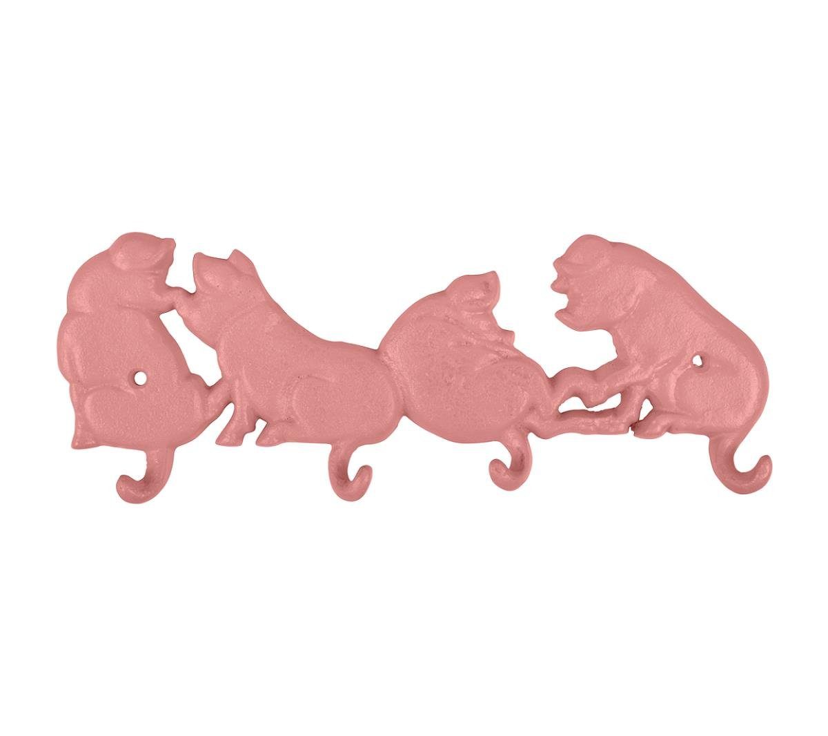 Schweine Hakenleiste, Wandhaken, Garderobenhaken, Schweine Haken, Schlüsselhaken aus Gusseisen in Altrosa. Die Hakenleiste hat vier Haken und ist mit zwei Bohrungen versehen und sieht sehr lustig aus. Befestigungsmaterial wird nicht mitgeliefert.