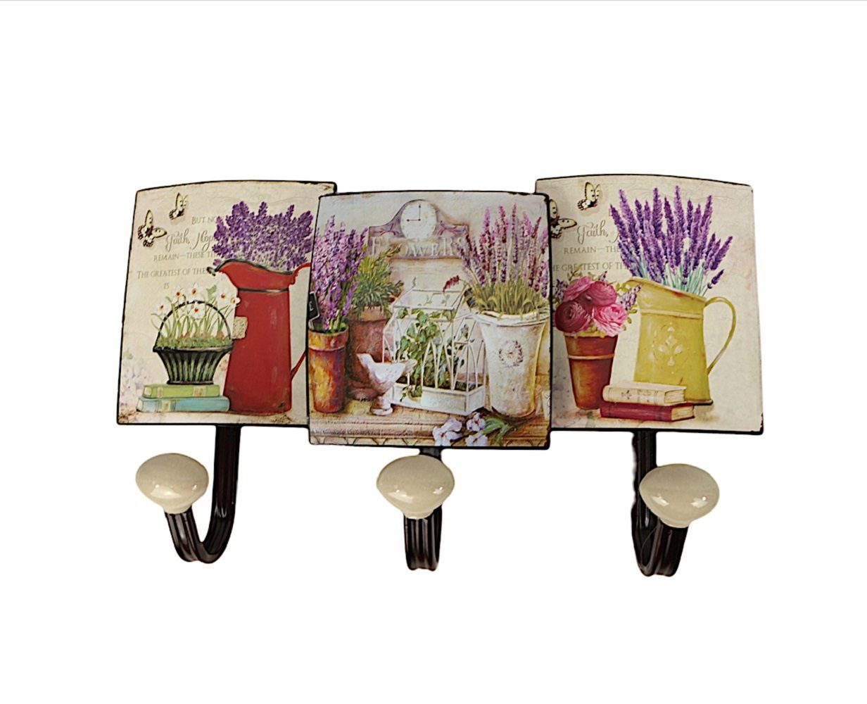 Hakenleiste mit Blechschildern und Lavendel Motiven, Garderobenhaken, Handtuchhalter, Wandhaken, Landhaus Handtuch Haken mit 3 Haken. Die Hakenköpfe sind aus Keramik gefertigt. Mögliche eingearbeitete Gebrauchsspuren sorgen für den rustikalen Charme unserer Produkte und sollen deren nostalgisches Aussehen unterstreichen.