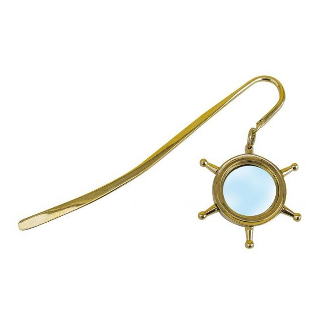 Seemanns Lesezeichen mit Lupe im Steuerrad, Leselupe zum Einhängen in ein Buch aus poliertem Messing. Die Glaseinfassung in Form eines Steuerrad ist aus poliertem Messing gefertigt.