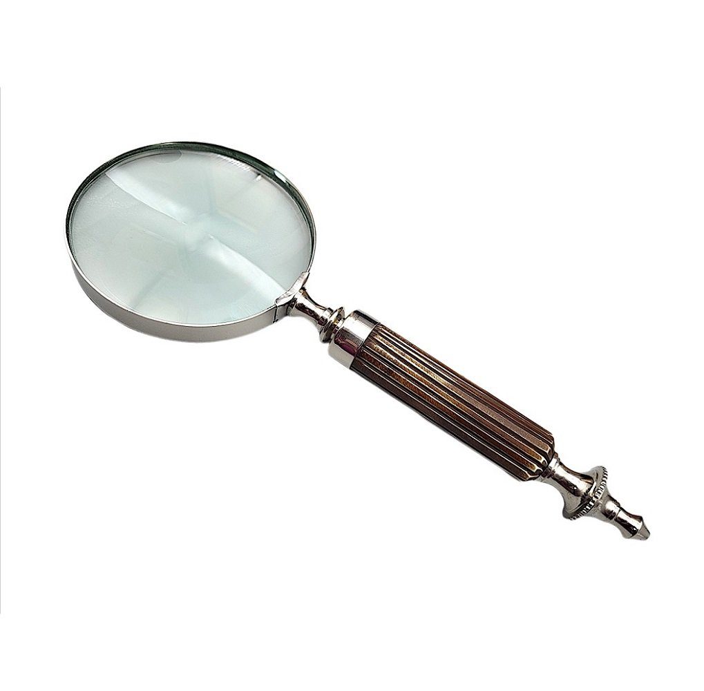 Leselupe, Vergrößerungsglas, Lesehilfe Sehhilfe aus vernickeltem Messing mit profiliertem Beingriff.