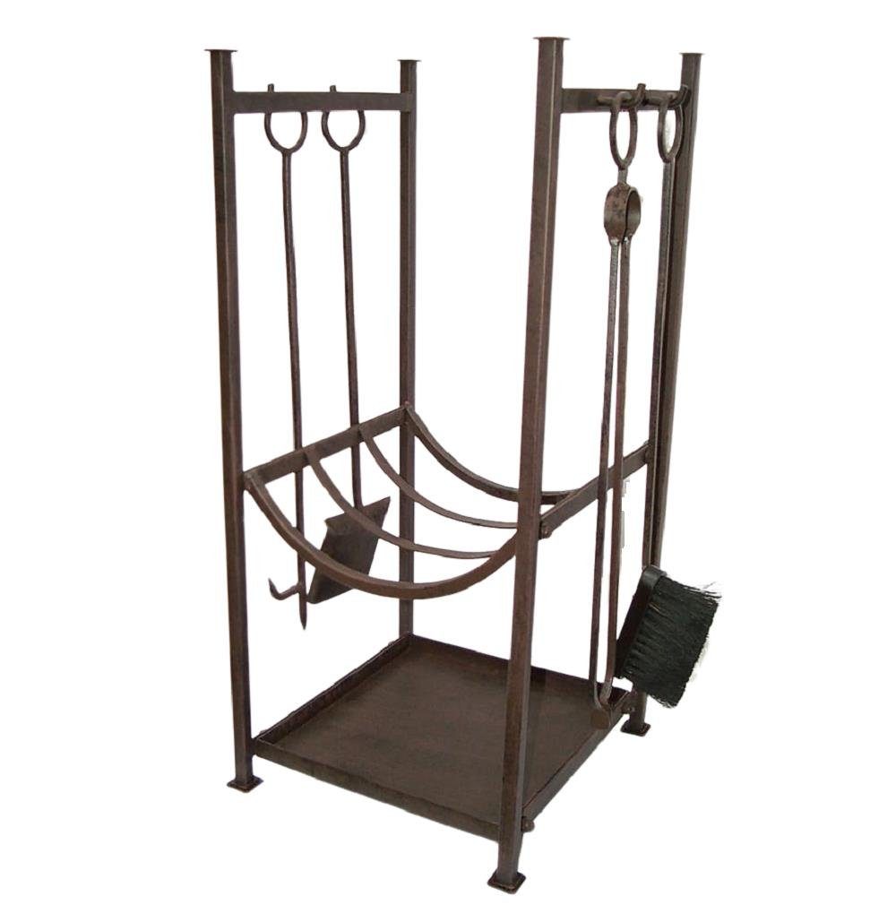 Große Kaminbesteck mit Holzlager, 4-tlg Kamin Garnitur, Kaminholzregal mit Kehrbesteck im Landhausstil. Das Set enthält den Ständer mit Holzwanne und jeweils eine Schaufel, Zange, Stochereisen und Besen. Das Set ist Antik Braun Pulverbeschichtet