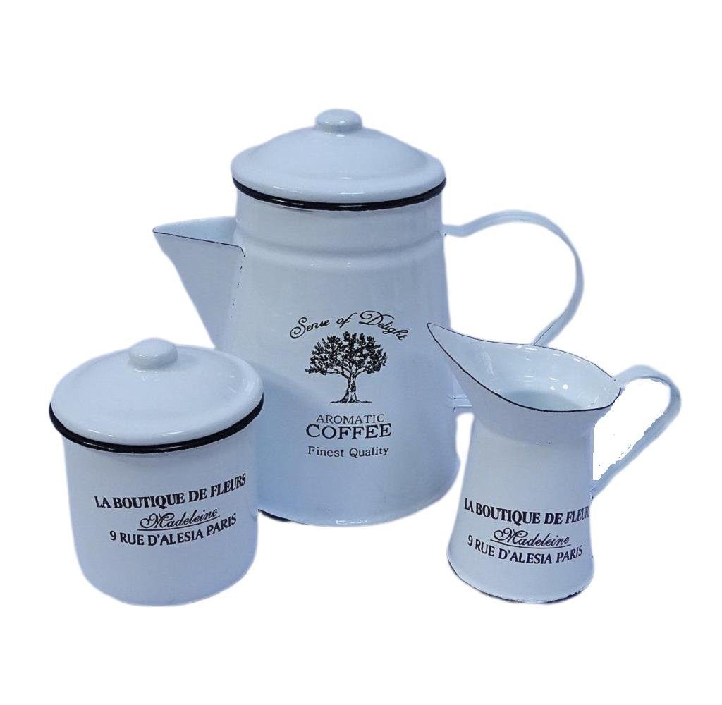 Drei teiliges Kaffee Kernstück, Kaffeekanne, Zuckerdose & Sahnekännchen im Landhausstil aus Emaille. Das Kernstück in leichter aber dekorativer Ausführung ist schwarz beschriftet. Wir bieten hunderte Emaille Artikel an. Besuchen Sie unsere Angebote und suchen Sie nach dem Stichwort "Emaille". Das produzieren von Gegenständen aus Emaille erfordert zu einem großen Teil reine handwerklicher Arbeit. Daher gleicht kein Produkt einer Serie dem anderen. Kleine Risse, Schrunden und Unebenheiten in den Oberfläche sind Folge des aufwendigen Produktionsprozesses und stellen keinen Qualitätsmangel dar.