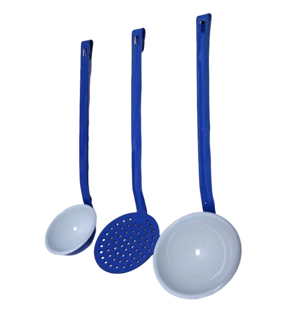 Nostalgie Löffelgarnitur, Küchenhelfer Set, Küchenhelfer, Kellen Set, Emaille weiß blau. Ein passendes Wandblech oder ein Komplett Set mit Wandblech finden Sie in unserem Angebot. Das produzieren von Gegenständen aus Emaille erfordert zu einem großen Teil reine handwerklicher Arbeit. Daher gleicht kein Produkt einer Serie dem anderen. Kleine Risse, Schrunden und Unebenheiten in den Oberfläche sind Folge des aufwendigen Produktionsprozesses und stellen keinen Qualitätsmangel dar.