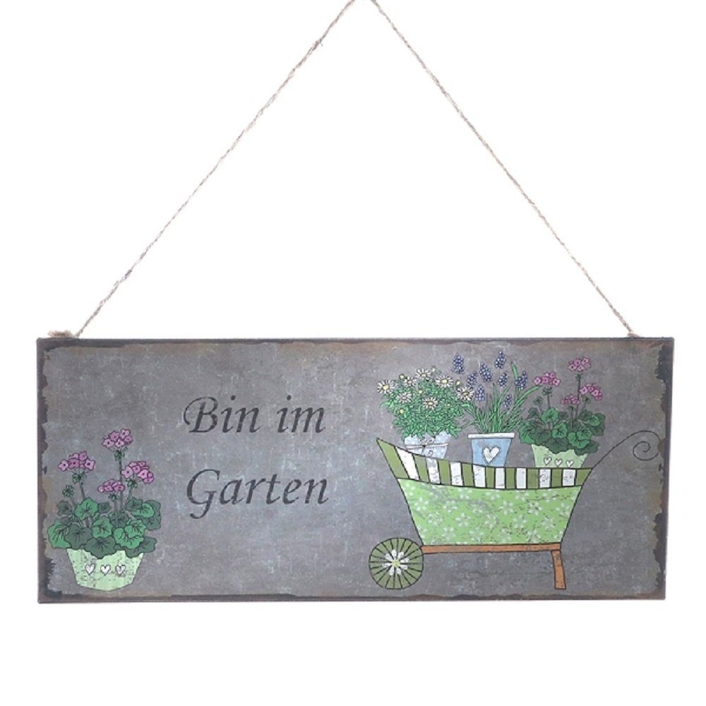 Blechschild, Wandschild, Bin im Garten, Gartenschild 13x31 cm. mit Juteanhänger. Das Schild ist für den Innenbereich, das Blechschild ist mit einem bedrucktem Papier bezogen und nicht Witterungsbeständig. Wenn Sie das Schild lackieren kann es auch bedingt Außen verwendet werden.