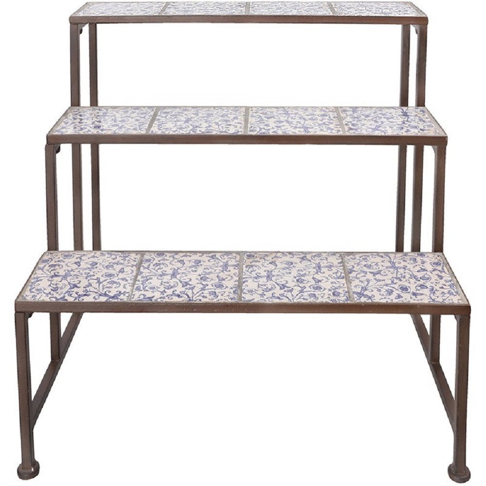 Pflanzen Etagere, Pflanztreppe, Blumenregal mit Keramik Kacheln und Blauem Barockmuster. Diese Treppe ist aus Eisen, verfügt über drei Etagen und ist mit stark krakelierten Keramikkacheln belegt. Diese Komposition erzeugt ein antikes Ambiente in Ihrem Garten. Diese Etagere sorgt nicht nur für eine stilvolle Atmosphäre, sondern ist auch ohne Pflanzen ein dekoratives Gartenaccessoire. Die drei Stufen bieten viel Platz für Blumen und Pflanzen. Diese Blumentreppe ist ein echter Blickfang für jeden Garten, im Haus oder auf der Terrasse. Stellen Sie die Treppe im Winter unbedingt in einen frostfreien Bereich, Frost und Wasser lassen bekanntlich den kompaktesten Felsen (Frostverwitterung) sprengen.