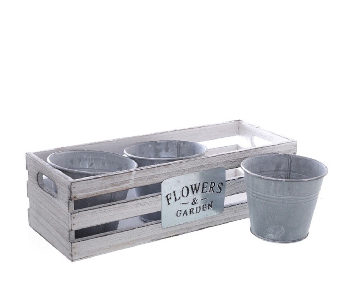 Pflanztopf Satz, 3 Blumentöpfe, Pflanzentöpfe in Holzkiste 'Flowers & Garden'. Sie erhalten drei Töpfe in einer rustikalen Holzkiste zum vielfältigen Einsatz im Garten oder zur Deko in Wohnung und Haus. Die Shabby Töpfe sind aus dünnwandigem, verzinktem Metall gefertigt. Sie eignen sich besonders gut als Pflanzentöpfe.