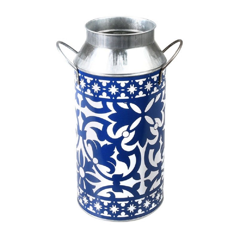 Milchkanne, Pflanzen-Kanne, Pflanztopf, Garten-Gefäß mit portugiesischem Muster aus Zink. Diese Milchkanne hat ein blau-weißes Design, das von den bekannten portugiesischen Fliesen abgeleitet ist. Die dekorative Kanne lässt sich vielseitig im Garten und im Wohnbereich einsetzen.