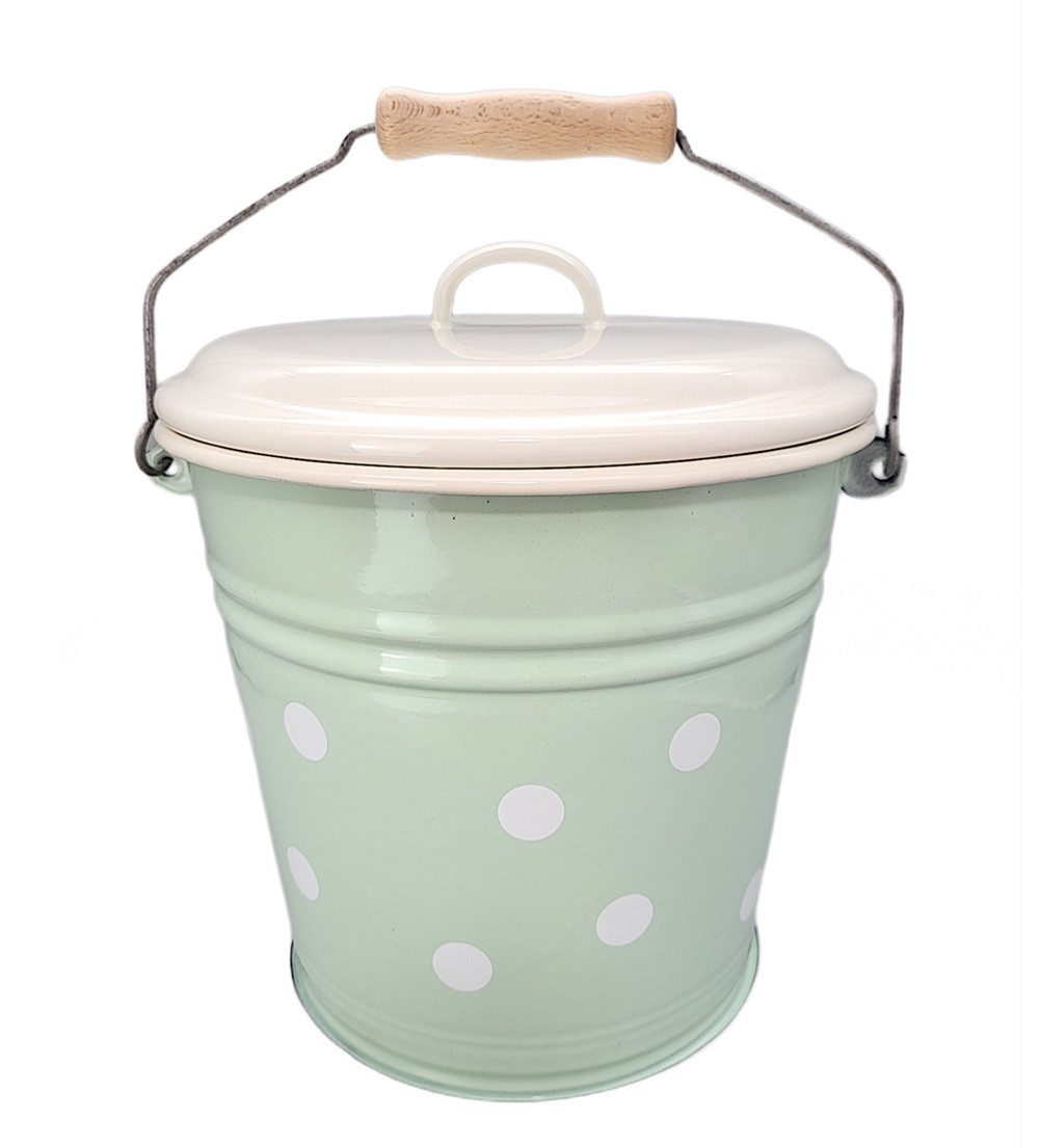 Emaille Eimer mit Deckel, Nostalgie Wassereimer, Mint mit Tupfen 6 Liter. Der Tragegriff ist mit einer ergonomisch gedrechselten Holzrolle ummantelt. Diesen Eimer haben wir in verschiedenen Dekoren. Wir führen Hunderte rustikale Emaille Artikel. Besuchen Sie unseren Shop und gehen dann auf die Rubrik Emaille. Das produzieren von Gegenständen aus Emaille erfordert zu einem großen Teil reine handwerklicher Arbeit. Daher gleicht kein Produkt einer Serie dem anderen. Kleine Risse, Schrunden und Unebenheiten in den Oberfläche sind Folge des aufwendigen Produktionsprozesses und stellen keinen Qualitätsmangel dar.