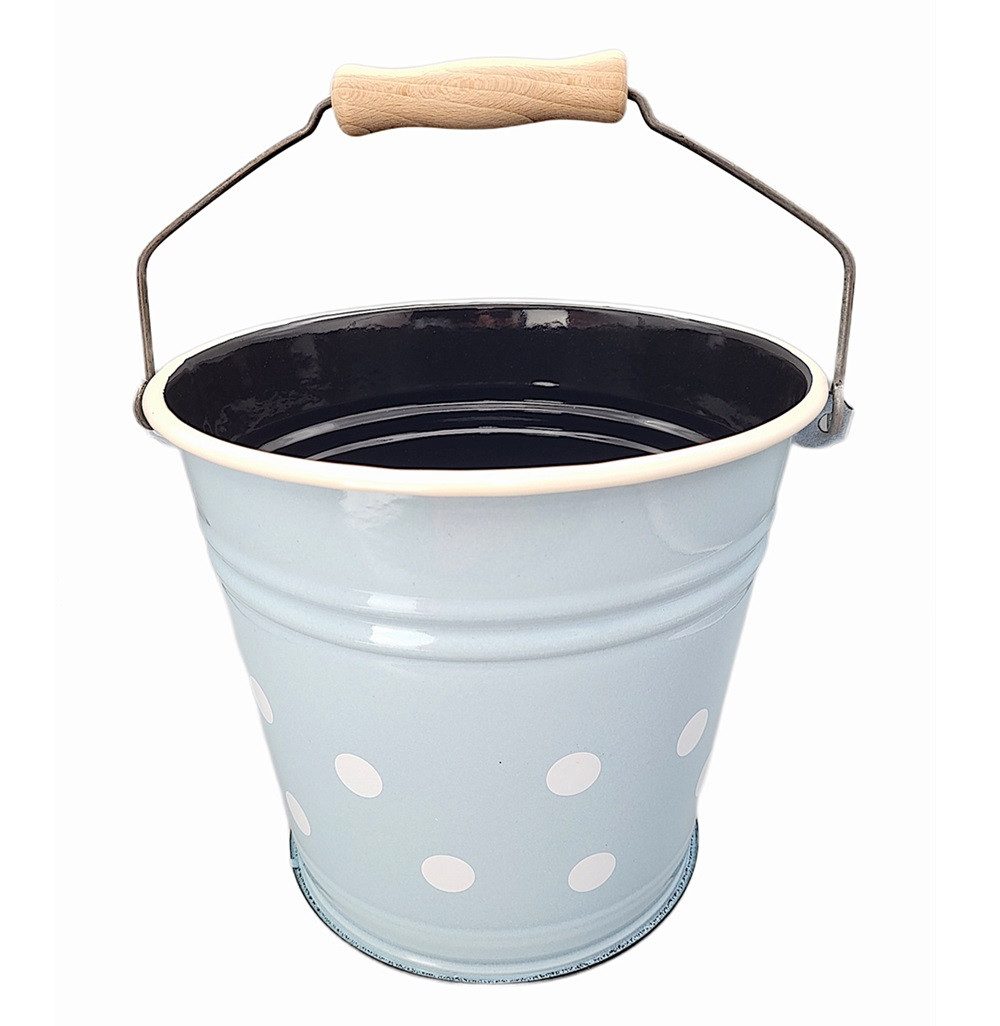 Emaille Eimer, Nostalgie Wassereimer, Hellblau mit Tupfen 6 Liter. Der Tragegriff ist mit einer ergonomisch gedrechselten Holzrolle ummantelt. Diesen Eimer haben wir in verschiedenen Dekoren. Wir führen Hunderte rustikale Emaille Artikel. Besuchen Sie unseren Shop und gehen dann auf die Rubrik Emaille. Das produzieren von Gegenständen aus Emaille erfordert zu einem großen Teil reine handwerklicher Arbeit. Daher gleicht kein Produkt einer Serie dem anderen. Kleine Risse, Schrunden und Unebenheiten in den Oberfläche sind Folge des aufwendigen Produktionsprozesses und stellen keinen Qualitätsmangel dar.