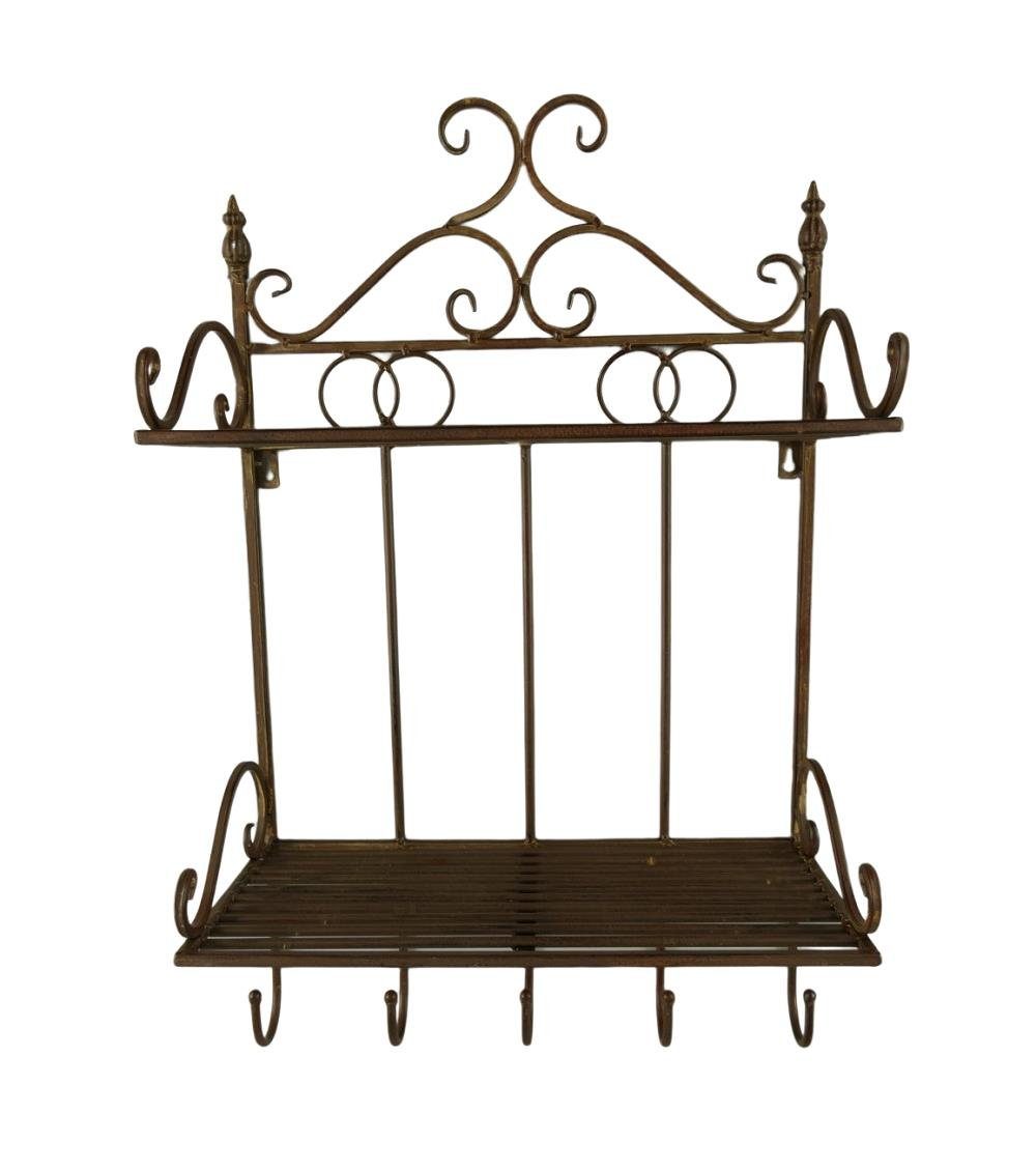 Landhaus Wandregal mit Hakenleiste, Hängeregal, Landhaus Regal mit Haken, Küchenregal aus Eisen in Antik Braun. Am unteren Ende befinden sich 5 gebogene Haken zum aufhängen von allerlei Gedöns. Das Regal ist für den Einsatz im Innen- und Außenbereich geeignet. Das Regal lässt sich für den Innen- und Außenbereich nutzen. Der Farbton kann unterschiedlich Antik Braun variieren.