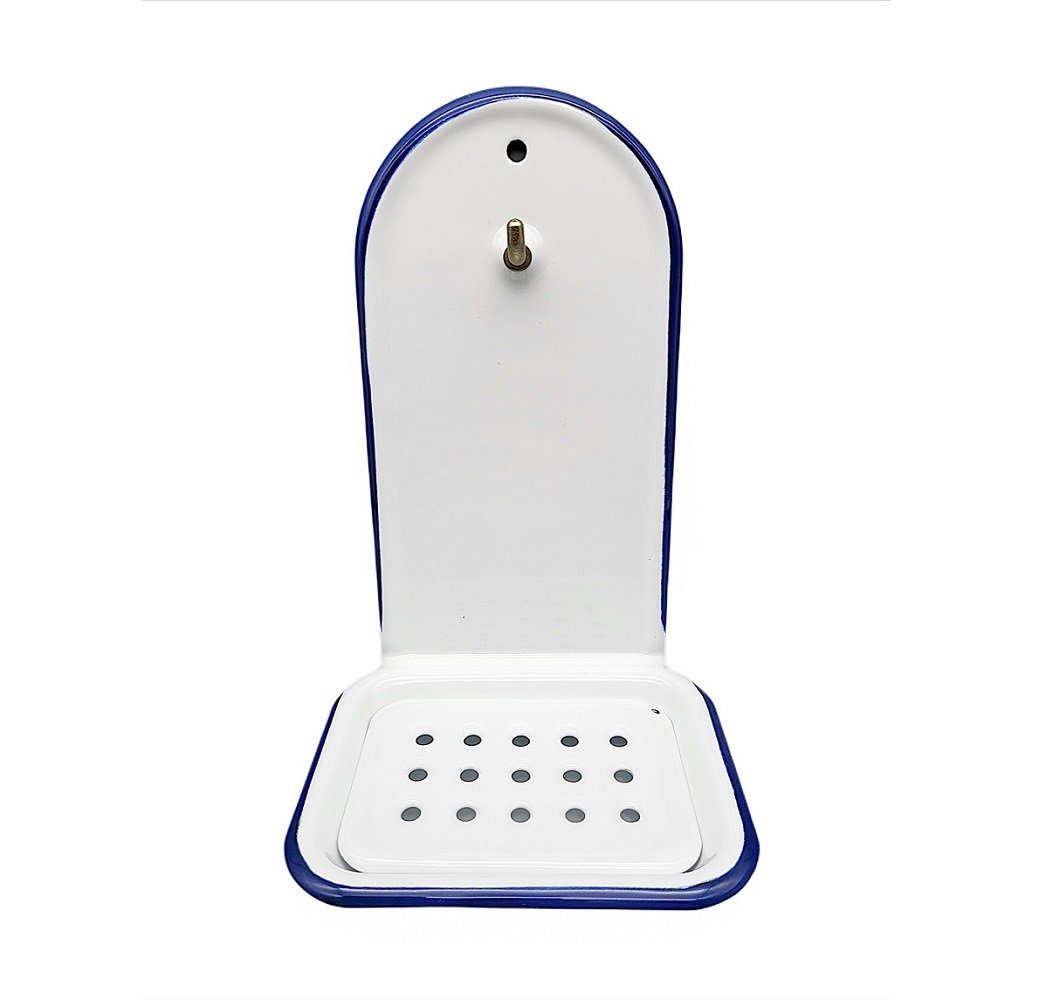 Nostalgie Seifenschale zum hängen, Seifenhalter mit Haken für eine Tasse oder einen Waschlappen, Seifenständer aus weißer Emaille mit blauem Rand. Diesen Artikel haben wir in unterschiedlichen Dekoren. Wir führen ein sehr umfangreiches Меню an Emailwaren.