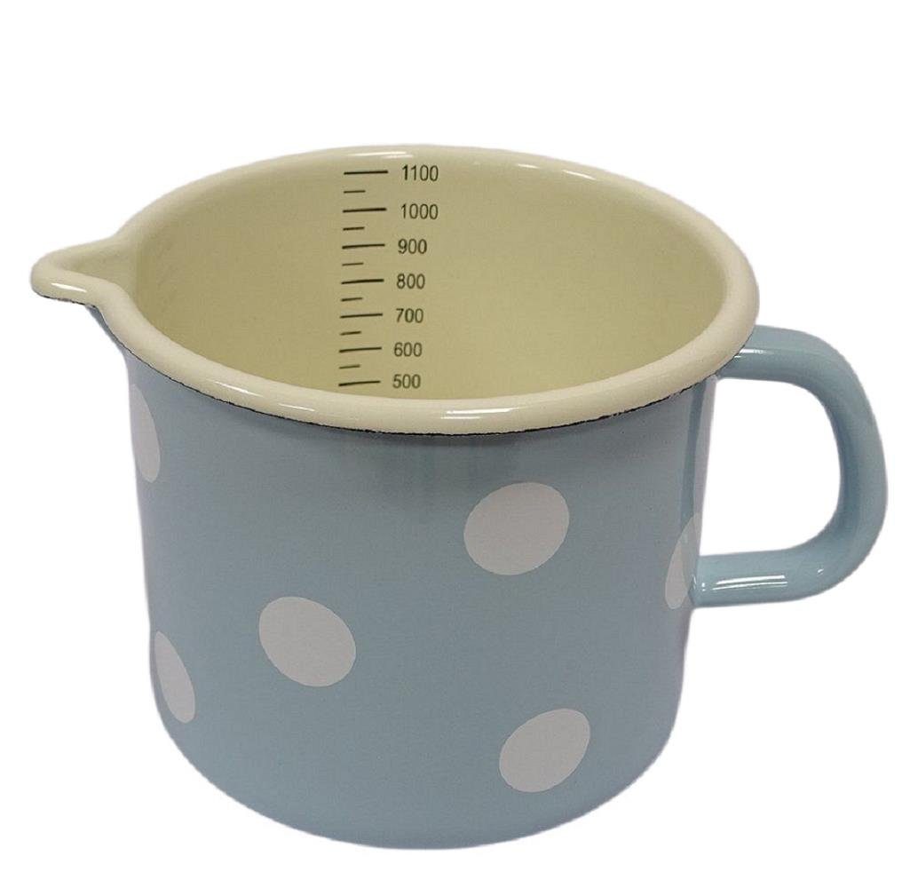 Milchtopf mit Skala, Maßbecher, Henkeltopf aus Emaille in pastell hellblau und cremefarbigen Tupfen, Kochtopf im Nostalgie Stil. Der Topf in dekorativer Ausführung ist für alle Herdarten geeignet. Wir bieten diesen Emaille Artikel in verschiedenen Dekoren an. Besuchen Sie unsere Angebote und suchen Sie nach dem Stichwort "Emaille". Das produzieren von Gegenständen aus Emaille erfordert zu einem großen Teil reine handwerklicher Arbeit. Daher gleicht kein Produkt einer Serie dem anderen. Kleine Risse, Schrunden und Unebenheiten in den Oberfläche sind Folge des aufwendigen Produktionsprozesses und stellen keinen Qualitätsmangel dar.