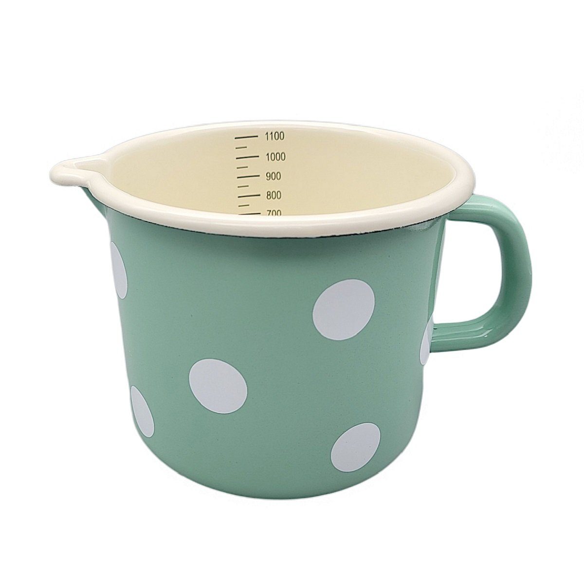 Milchtopf mit Skala, Maßbecher, Henkeltopf aus Emaille in pastell mint und cremefarbigen Tupfen, Kochtopf im Nostalgie Stil. Der Topf in dekorativer Ausführung ist für alle Herdarten geeignet. Wir bieten diesen Emaille Artikel in verschiedenen Dekoren an. Besuchen Sie unsere Angebote und suchen Sie nach dem Stichwort "Emaille". Das produzieren von Gegenständen aus Emaille erfordert zu einem großen Teil reine handwerklicher Arbeit. Daher gleicht kein Produkt einer Serie dem anderen. Kleine Risse, Schrunden und Unebenheiten in den Oberfläche sind Folge des aufwendigen Produktionsprozesses und stellen keinen Qualitätsmangel dar.