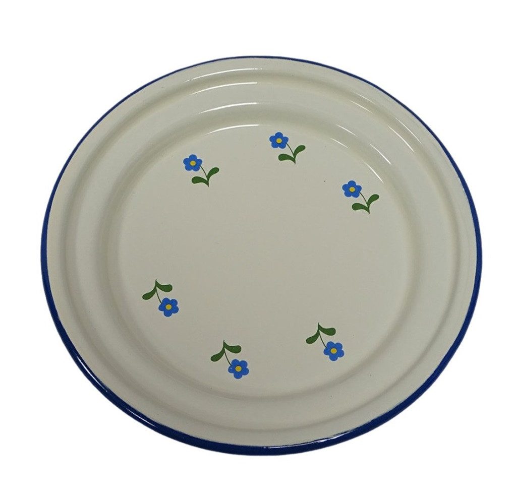 Emaille Dessertteller, Anbietteller, Eisteller, Kinderteller, Creme Blümchen 18 cm. Diesen Teller haben wir in verschiedenen Dekoren. Wir führen Hunderte rustikale Emaille Artikel. Besuchen Sie unseren Shop und gehen dann auf die Rubrik Emaille. Das produzieren von Gegenständen aus Emaille erfordert zu einem großen Teil reine handwerklicher Arbeit. Daher gleicht kein Produkt einer Serie dem anderen. Kleine Risse, Schrunden und Unebenheiten in den Oberfläche sind Folge des aufwendigen Produktionsprozesses und stellen keinen Qualitätsmangel dar.