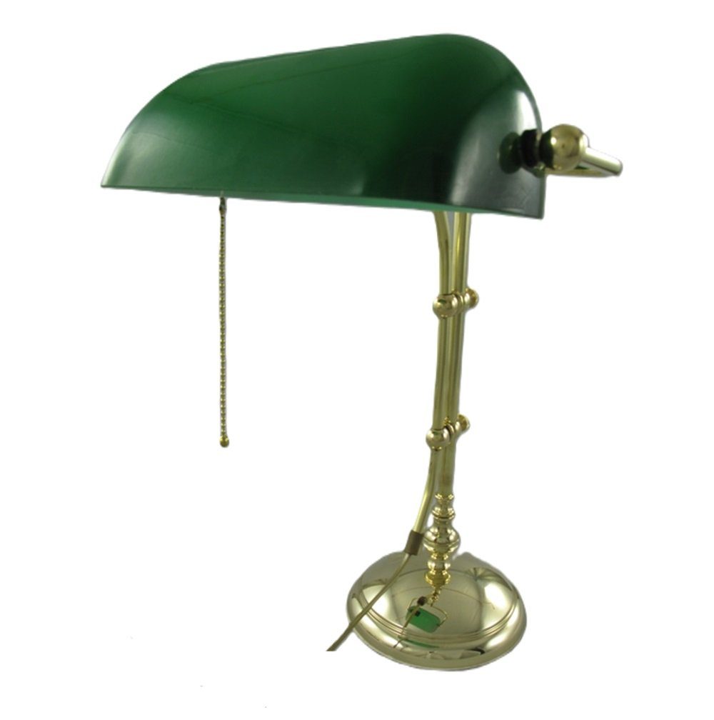 Wertige Art Deco Banker Lampe, Büro Leuchte, Tischlampe aus poliertem Messing. Schwere, höhenverstellbare Messing Lampe mit grünem Glas Schirm. Sie hat einen mundgeblasenen Glasschirm mit milchig weißem Unterfang (hier sind kleine Lufteischlüsse möglich). Die Lampe ist an mehreren Stellen schwenk- und verstellbar. Die Lampe hat einen Zugschalter unter dem Glasschirm. Die Lampe ist aus massivem und poliertem Messing gefertigt, im Standfuß ist innenseitig eine schwere Eisenplatte eingesetzt und dient der Stabilität!