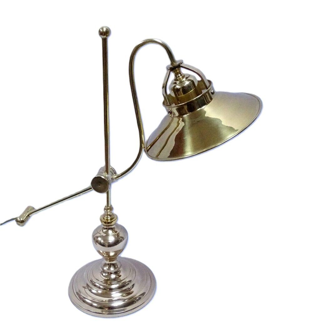 Schreibtisch Lampe, maritime Tischleuchte, Messing Bankerlampe, Büro Leuchte. Höhenverstellbare Kapitäns Lampe mit einem Schuster Schirm aus poliertem Messing. Die Lampe ist an mehreren Stellen schwenk- und verstellbar. Die Lampe hat einen Schnurschalter am Kabel. Die Lampe ist aus massivem und poliertem Messing gefertigt, im Standfuß ist innenseitig eine Eisenplatte eingesetzt und dient der Stabilität!