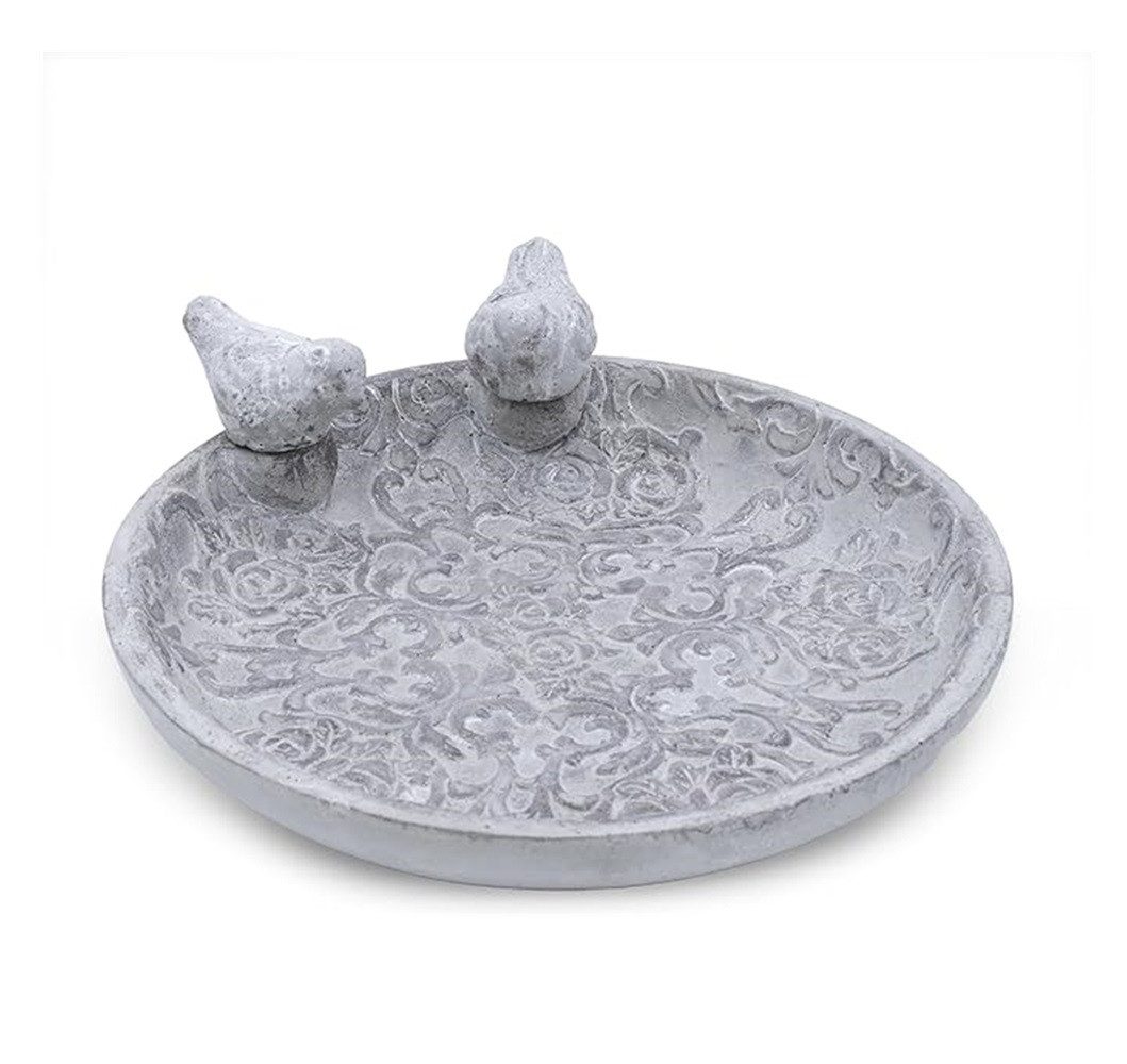Beton Vogeltränke, Landhaus Vogelbad, Futterplatz aus Beton mit zwei Vögeln. Zwei Vögelchen haben sich bereits eingefunden. Wir empfehlen dringend diesen Artikel keinem Frostwetter auszusetzen. Frost und Eis entwickeln eine große Sprengkraft und können bekanntlich die schönste Gartendekoration zerstören.