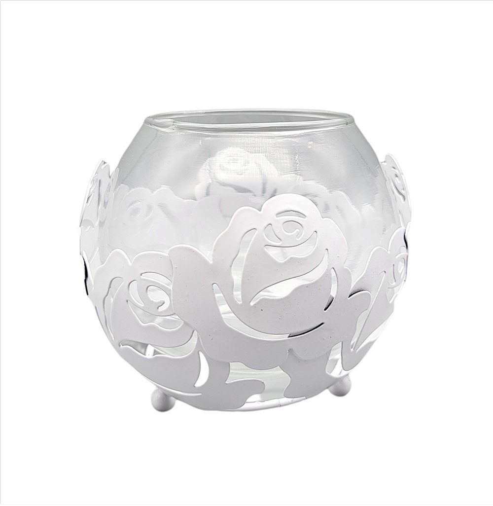 Windlicht Glas "Rose" Windlichthalter mit Glaseinsatz, Vintage Teelichthalter, Kerzenhalter im Retrostil. Romantischer Teelichthalter mit Rosenblüten Motiv, ein Muss für alle Rosenfreunde.