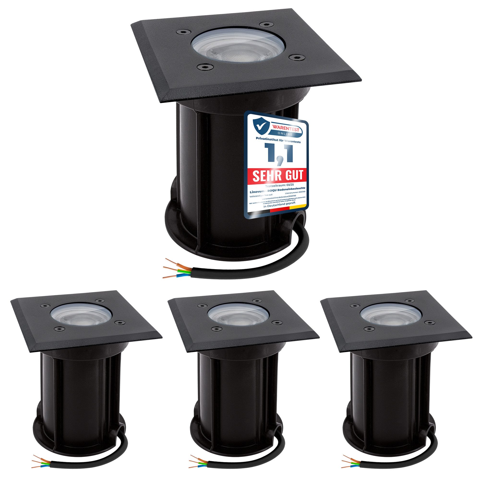 Lieferumfang | 4x Bodeneinbauleuchte BOQU schwarz4x LED Lampe GU10 3W neutralweiß4x Einbaudose |