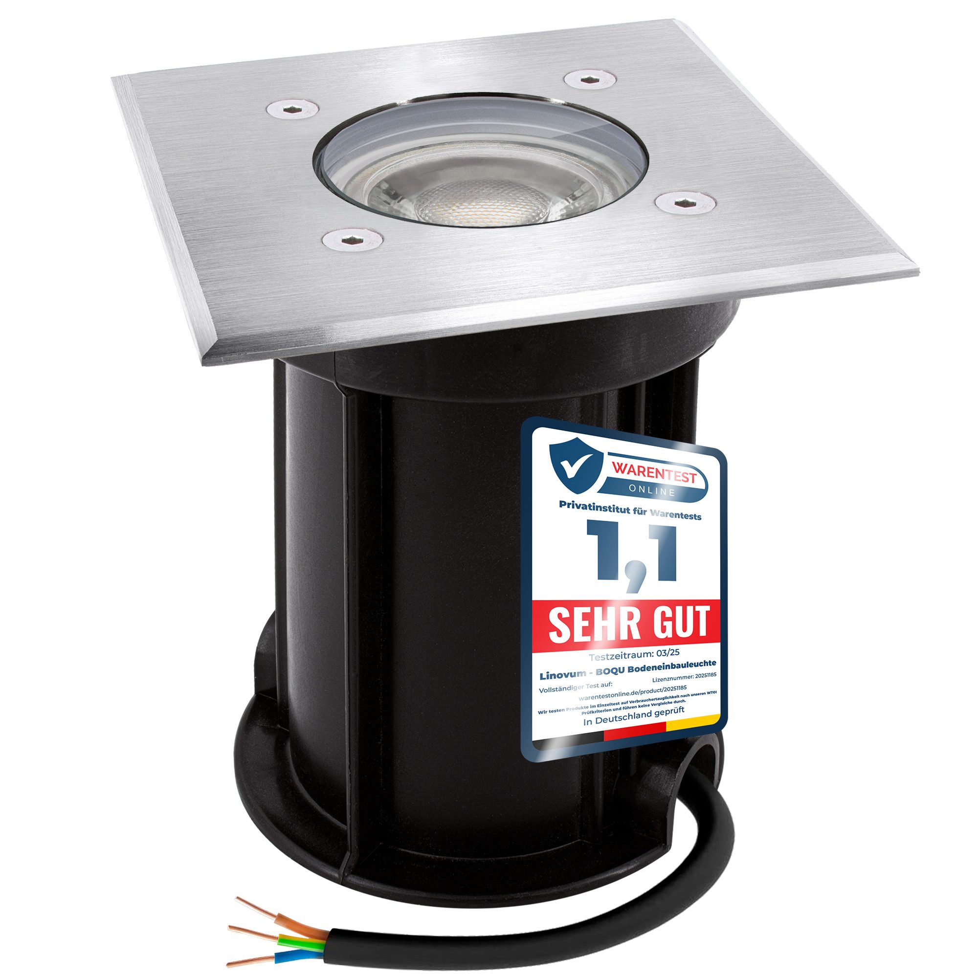 Lieferumfang | 1x Bodeneinbauleuchte BOQU quadratisch Stahl gebürstet vorinstalliertes Kabel1x LED Leuchtmittel GU10 6W neutralweiß |