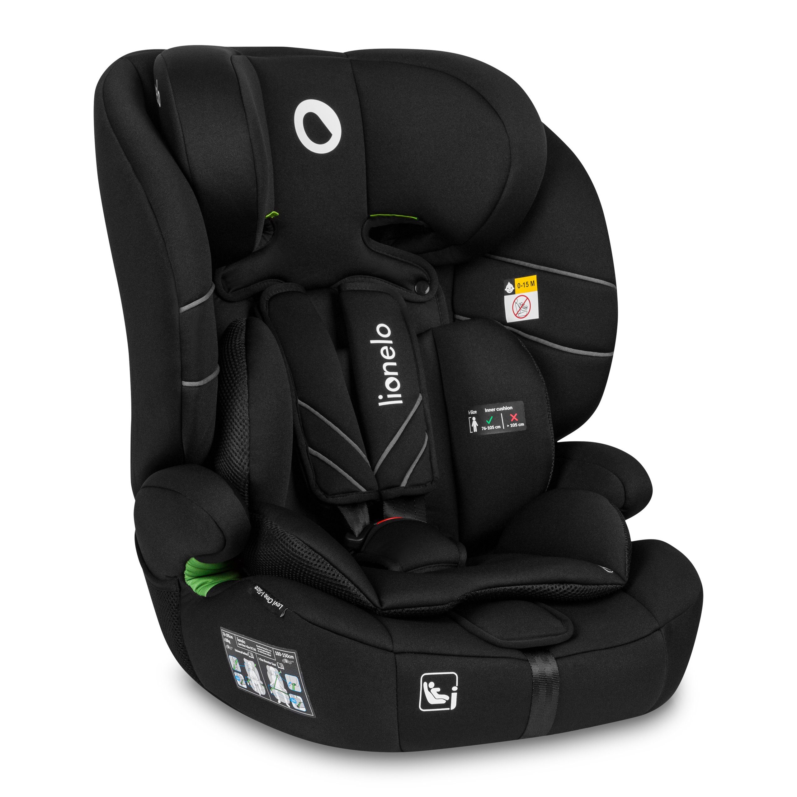 Der Sitz ist für den vorwärtsgerichteten Einbau (FWF) konzipiert. Der Levi One i-Size wird mit den Sicherheitsgurten des Autos befestigt, wodurch der Sitz für fast alle Automodelle geeignet ist. Kinder mit einer Körpergröße von 76-105 cm sollten mit den Sicherheitsgurten des Autos und dem 5-Punkt-Gurt des Sitzes gesichert werden, während ältere Kleinkinder (105-150 cm) nur mit den Sicherheitsgurten des Autos gesichert werden sollten. Komfort-Armlehnen halten den Gurt in der richtigen Position und grüne Markierungen zeigen die richtige Einbaurichtung an.