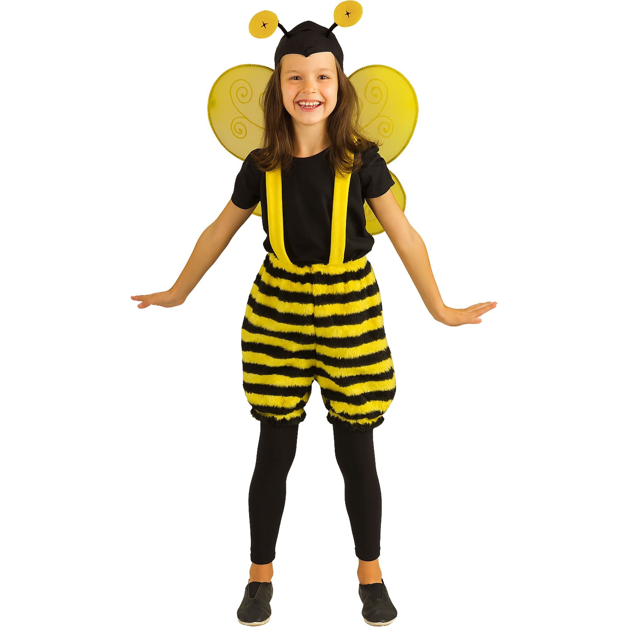 Das zweiteilige Kostüm besteht aus einer weichen, kurz geschnittenen Plüsch-Hose im typischen schwarz-gelben Bienenlook. Die gelben Träger lassen sich bequem binden und sorgen für einen sicheren Sitz beim fröhlichen Umherfliegen. Die schwarze Bienenmütze ist mit zwei gelben Fühlern verziert – ein echter Hingucker für kleine Naturfreunde.