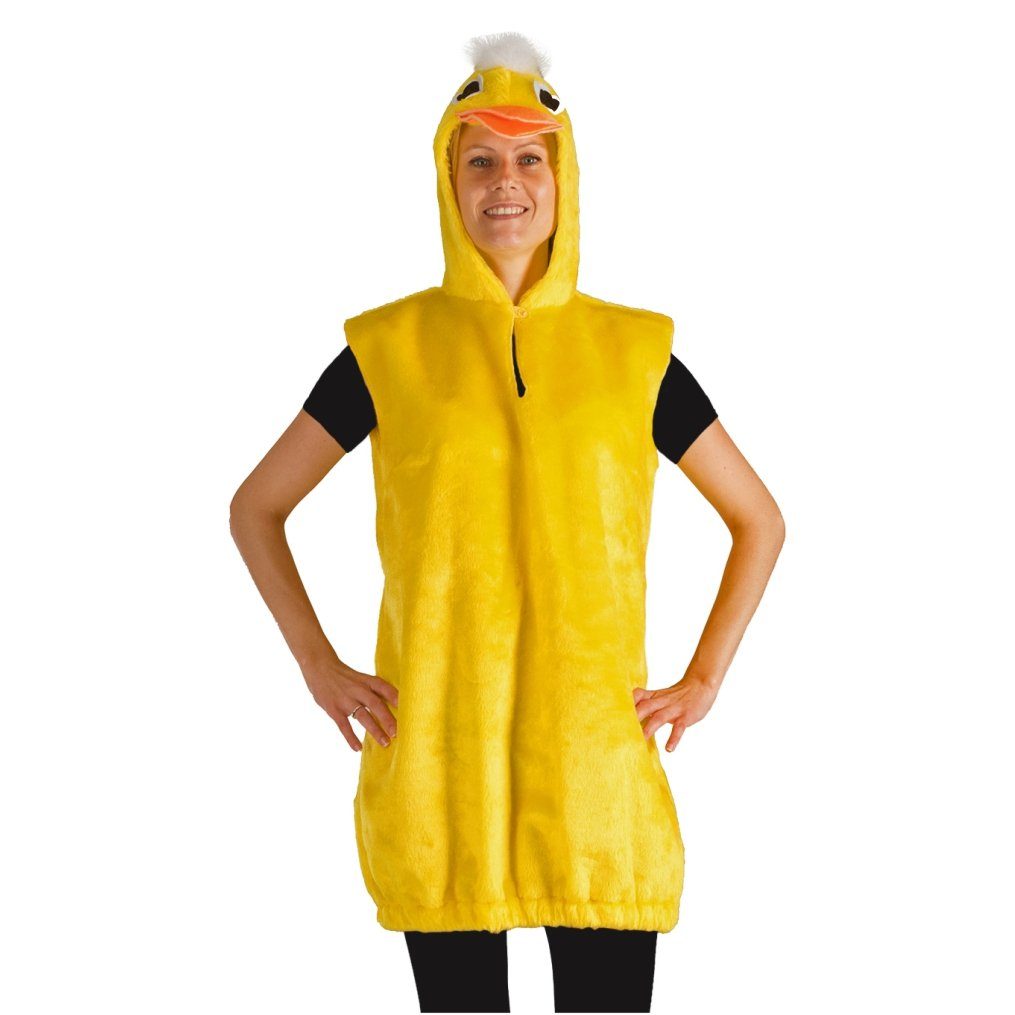 Dieses kuschlige und hochwertige Entenkostüm für Damen und Herren besteht aus einem kurzen gelben Overall mit Kapuze. Die Kapuze ist als süßes Entengesicht mit Schnabel, Augen und Hahnenkamm gearbeitet. Das Entenkostüm kann mit einem Langarmshirt oder einer Strumpfhose kombiniert werden. Der weiche Plüschoverall ist auch über der Kleidung tragbar und somit super für den Straßenkarneval geeignet. Ein tolles Entenkostüm für Fasching oder zur Mottoparty!