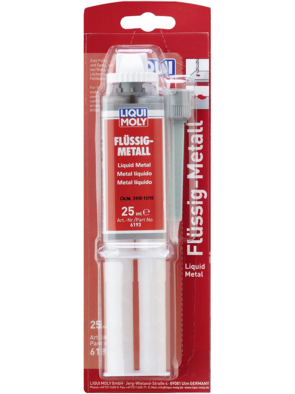Liqui Moly Flüssig-Metall ist ein schnellhärtender 2-K-Epoxy-Kleber, der über eine sehr hohe Festigkeit verfügt. Nach der Aushärtung kann die reparierte Stelle nach Aushärtung spanabhebend weiterbearbeitet, geschliffen oder überlackiert werden. Zum Füllen und Spachteln von Rissen, Löchern, Fehlbohrungen, Lunkerstellen sowie zur Reparatur an Rohren, Tanks, Gewinden, Karosserie- und Maschinenteilen oder zum Verkleben verschiedener Materialien mit- und untereinander. Ersatzmischer (Mischerspritze mit Gewinde, Art.-Nr. 6029).