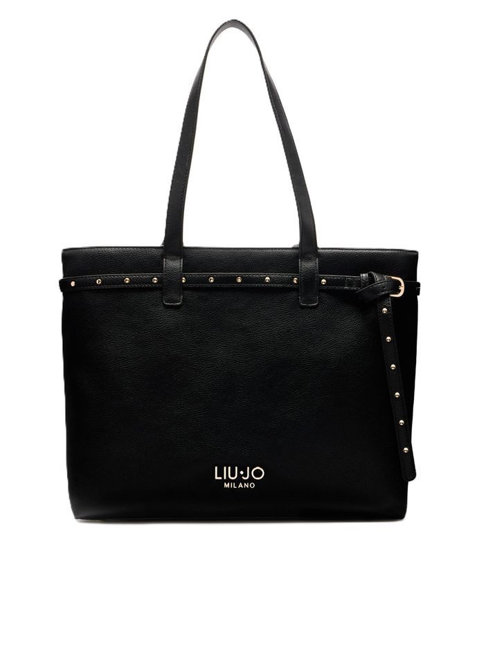 Liu Jo Handtasche in Schwarz mit strukturierter Oberfläche, Metalllogo und modischem Nieten-Gurt – perfekte Damentasche für Alltag und Büro.