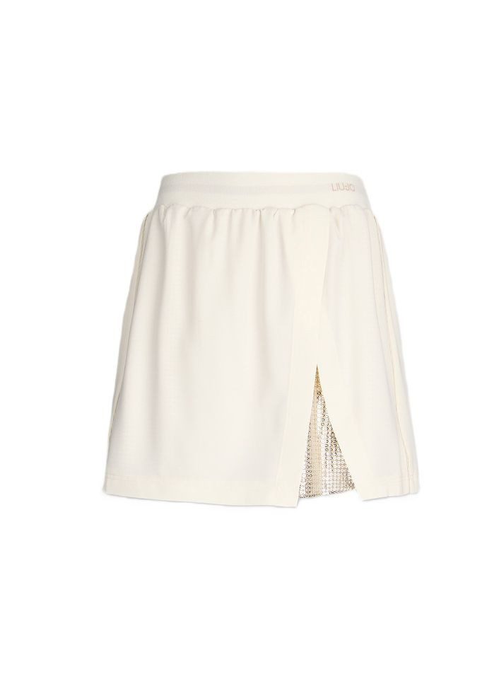Der Liu Jo Minirock kombiniert glamouröse Details mit modernem Design. Hergestellt aus hochwertigem Stretchjersey, sorgt der Rock für eine perfekte Passform und hohen Tragekomfort. Die aufgesetzten Pailletten verleihen ihm einen stilvollen Glanz, während der Schlitz auf der Vorderseite eine feminine und raffinierte Note setzt. Der elastische Taillenbund mit Jacquard-Logo bietet eine bequeme Passform und unterstreicht den eleganten Look.