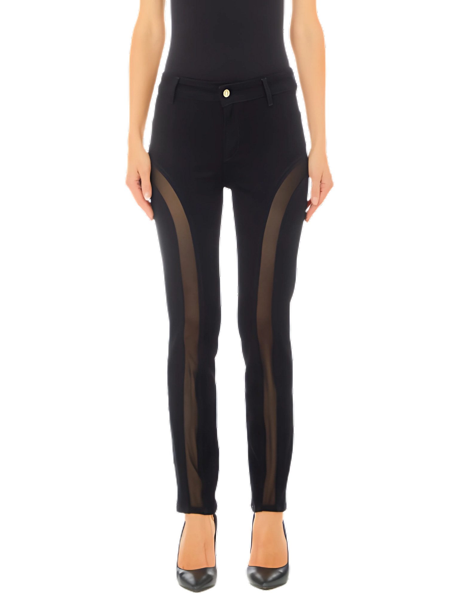 Die Liu Jo Damenhose hat ein hohes Taillendesign. Auffällig sind die transparenten Einsätze, die entlang der Außenseite jedes Beins bis zu den Knöcheln verlaufen. Die Hose verleiht jedem Outfit einen eleganten und modernen Look.