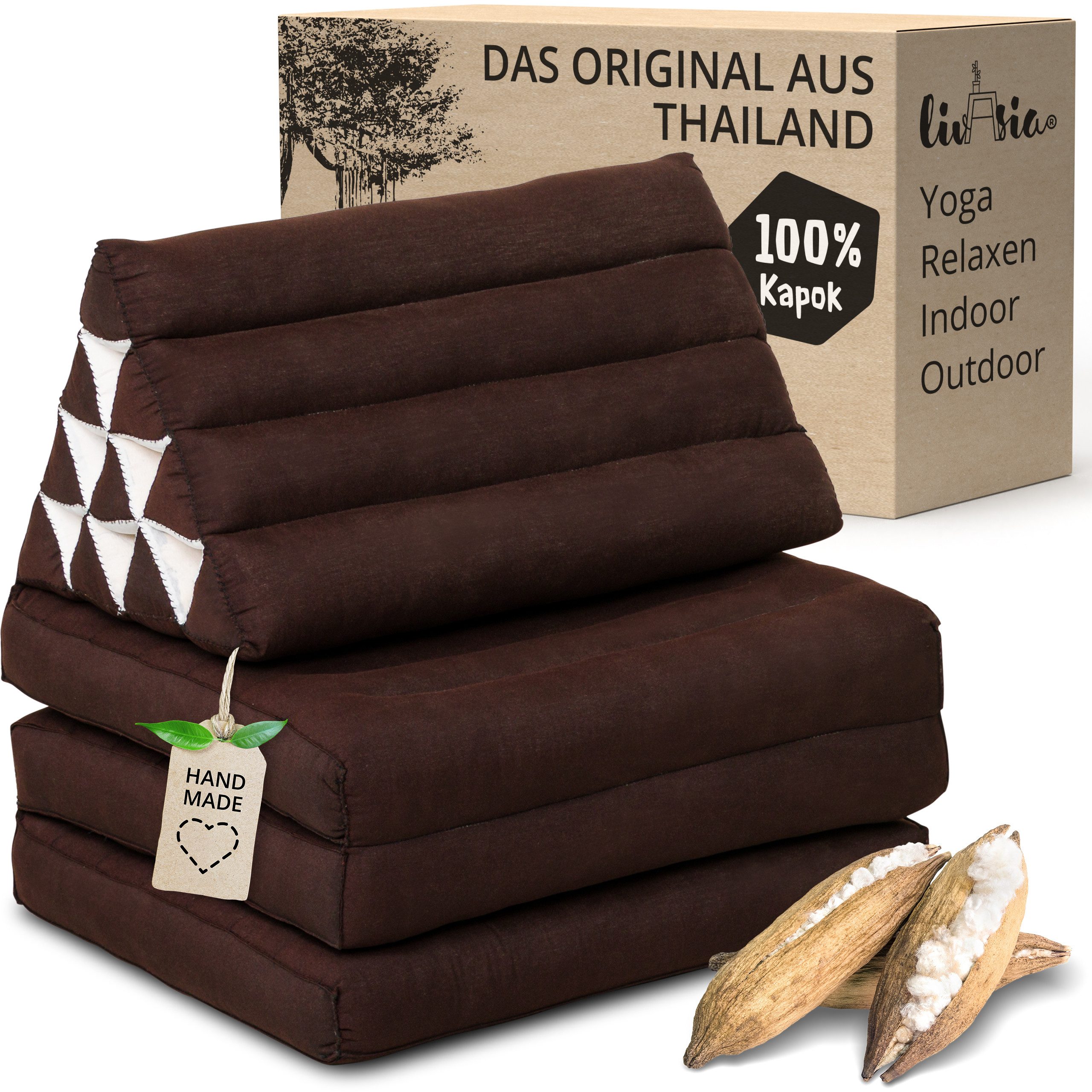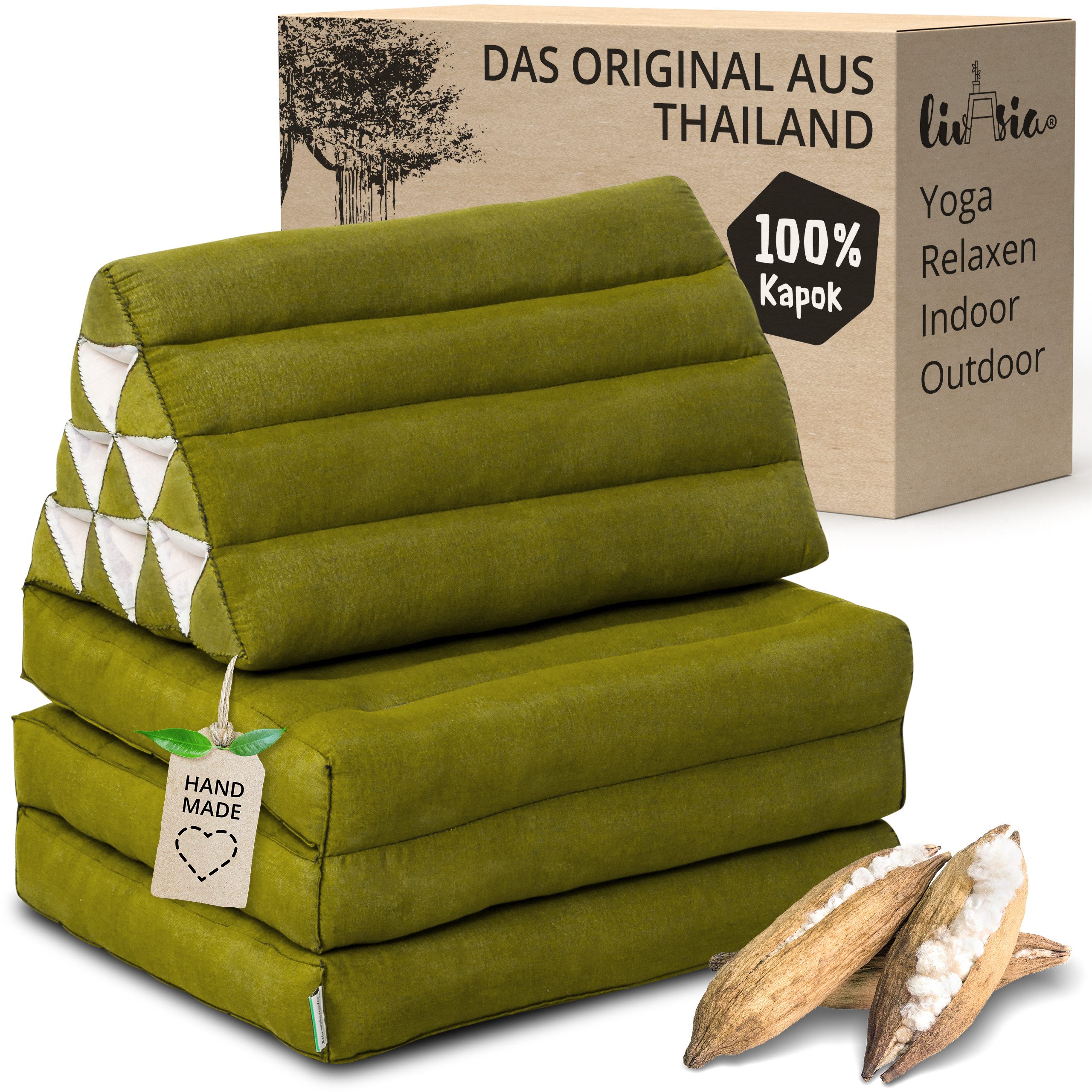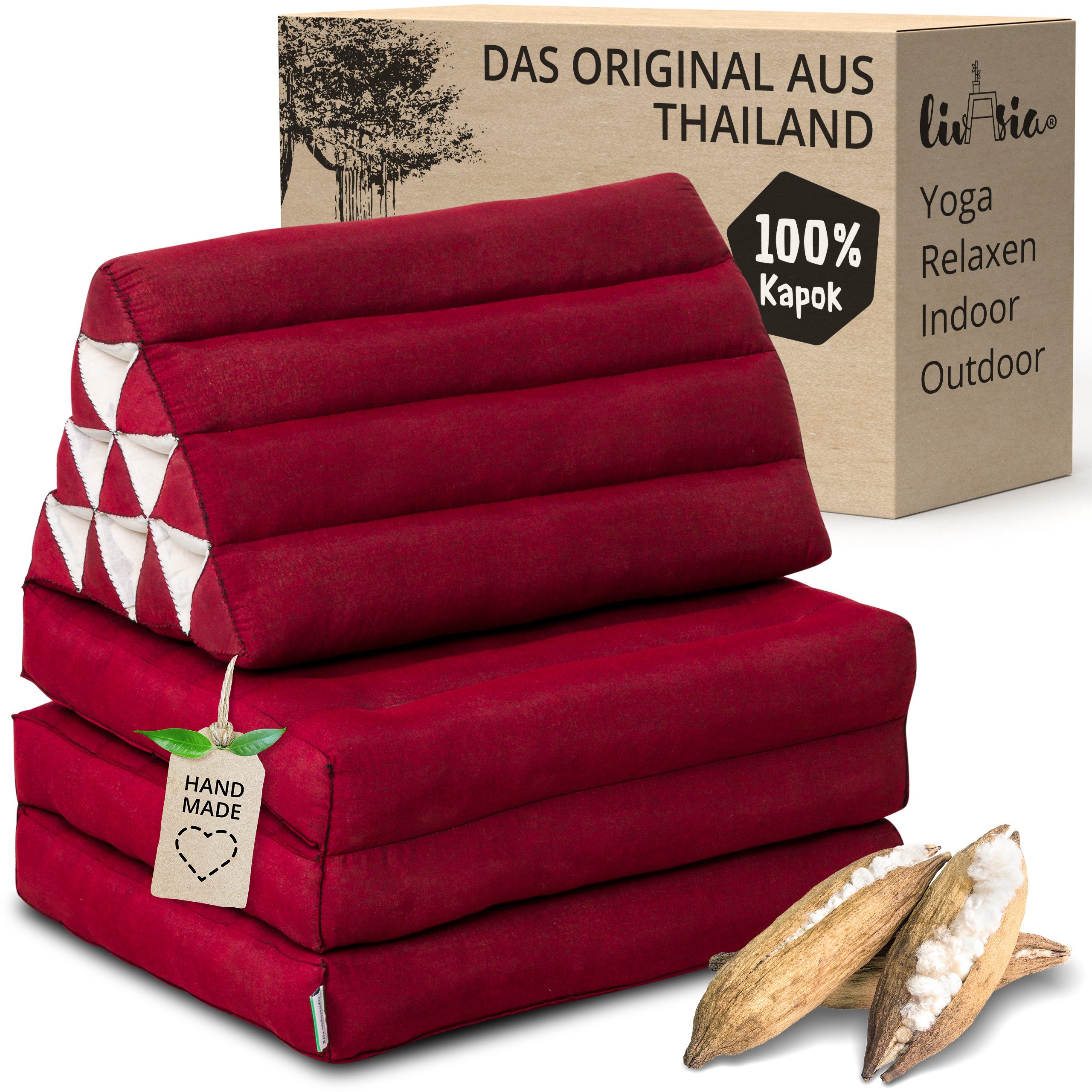 Das Geheimnis steckt im Dreieck. Es ist formfest und dient als gemütliche Rückenlehne. Die drei klappbaren Auflagen zeichnen sich ebenfalls durch ihre Festigkeit aus und machen das Thaikissen zum komfortablen Allrounder. Mit viel Herz wurde das Thaikissen in Handarbeit hergestellt. Es ist robust und langlebig. Die Füllung besteht zu 100% aus naturbelassener Kapokfaser. Ihre feuchtigkeits- und wärmeisolierende Beschaffenheit sorgt dafür, dass das Kissen dir auch auf feuchtem, kühlem Boden – und sogar auf einem Boot – Bequemlichkeit spendet.