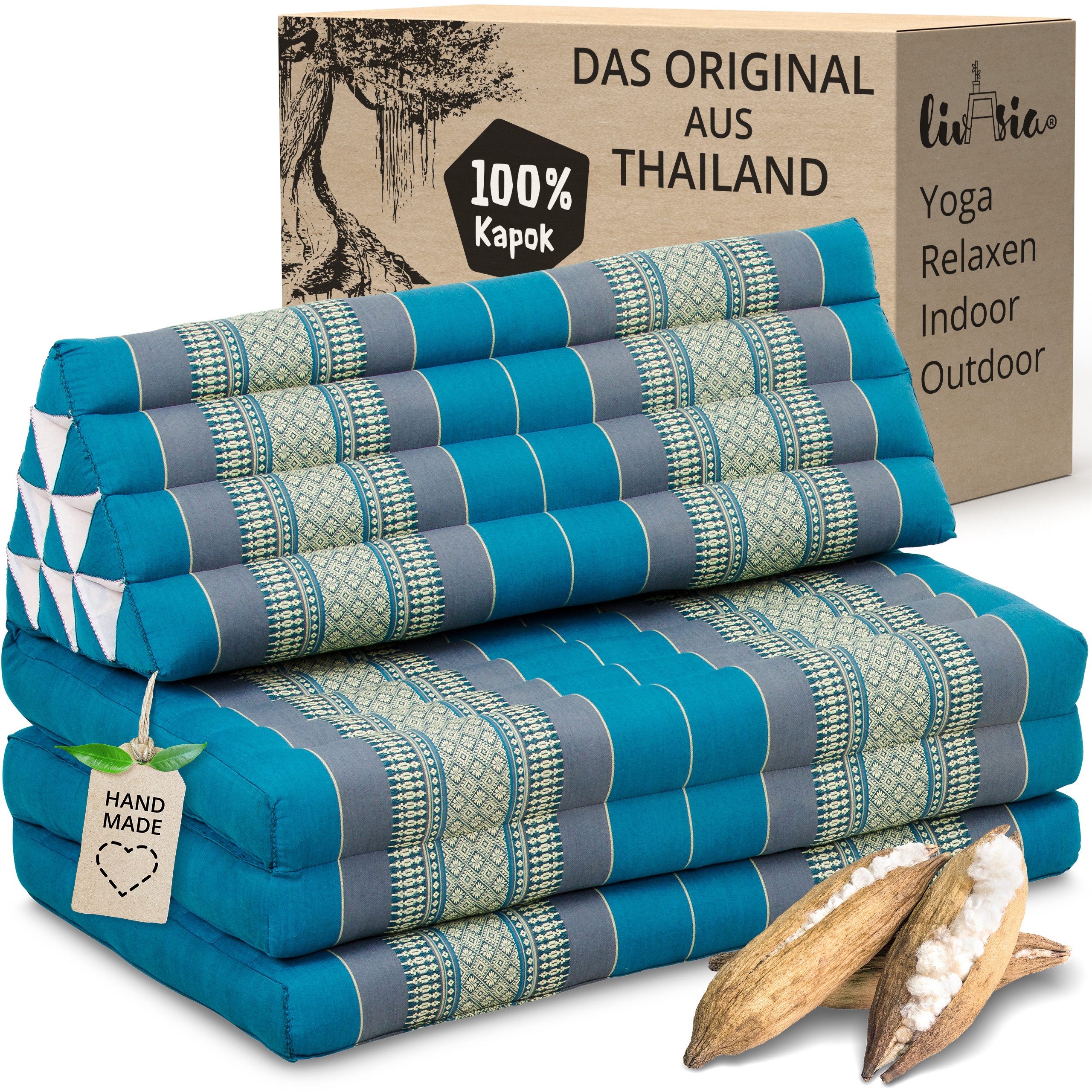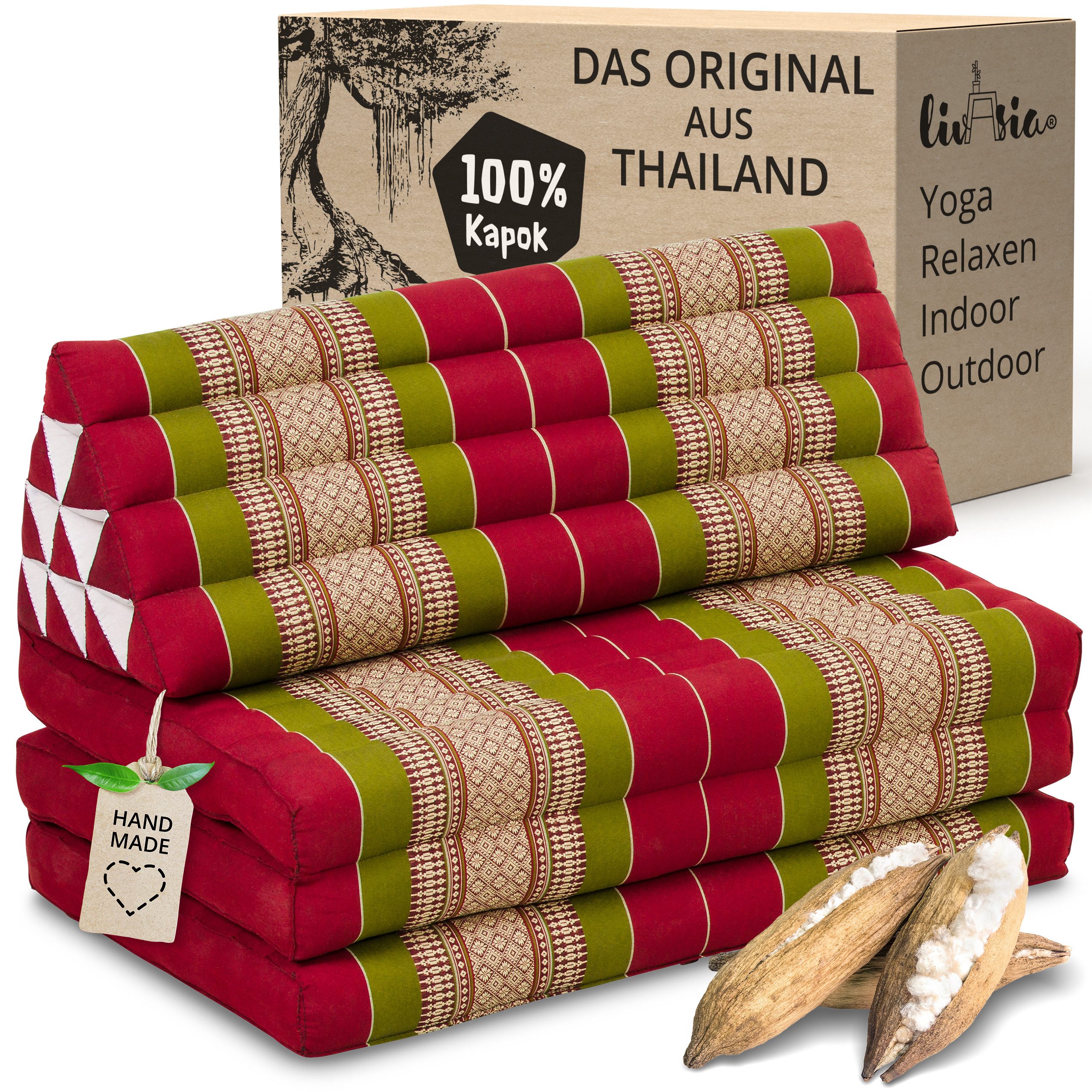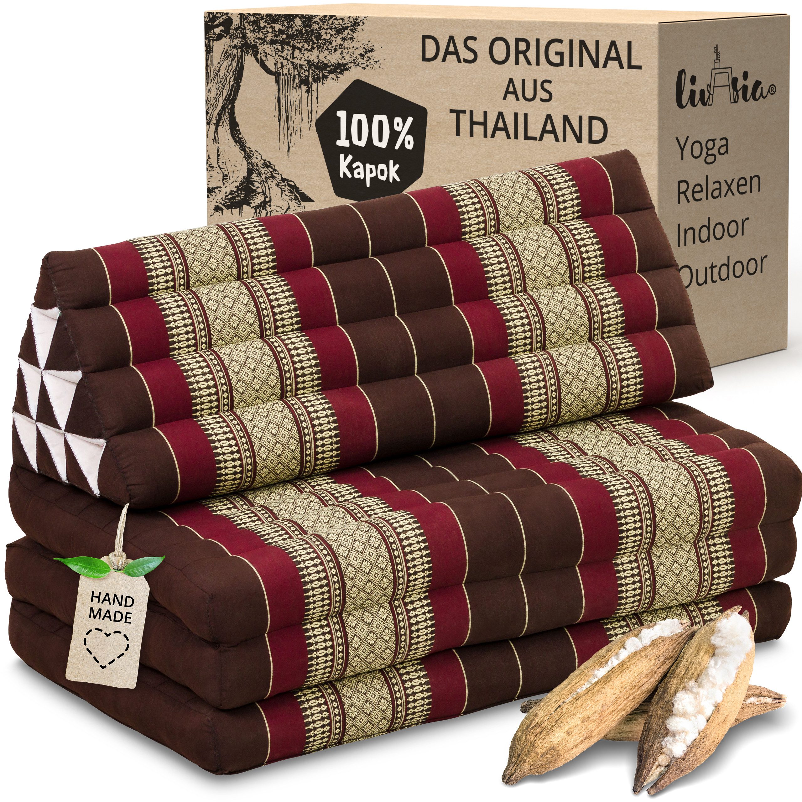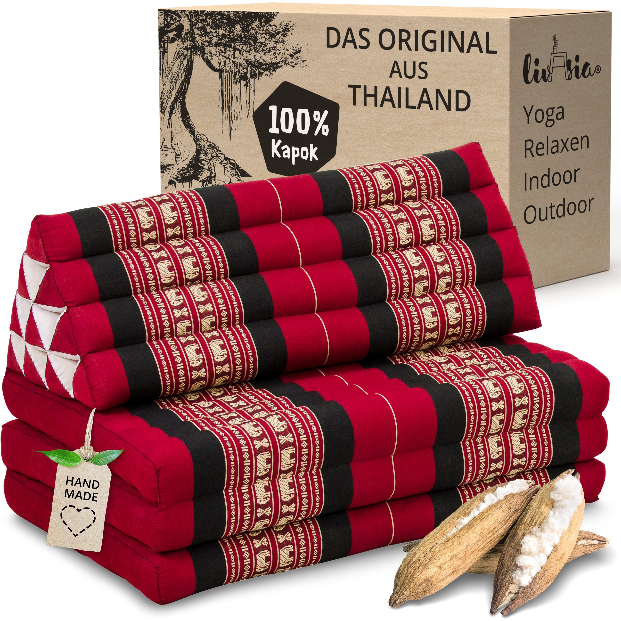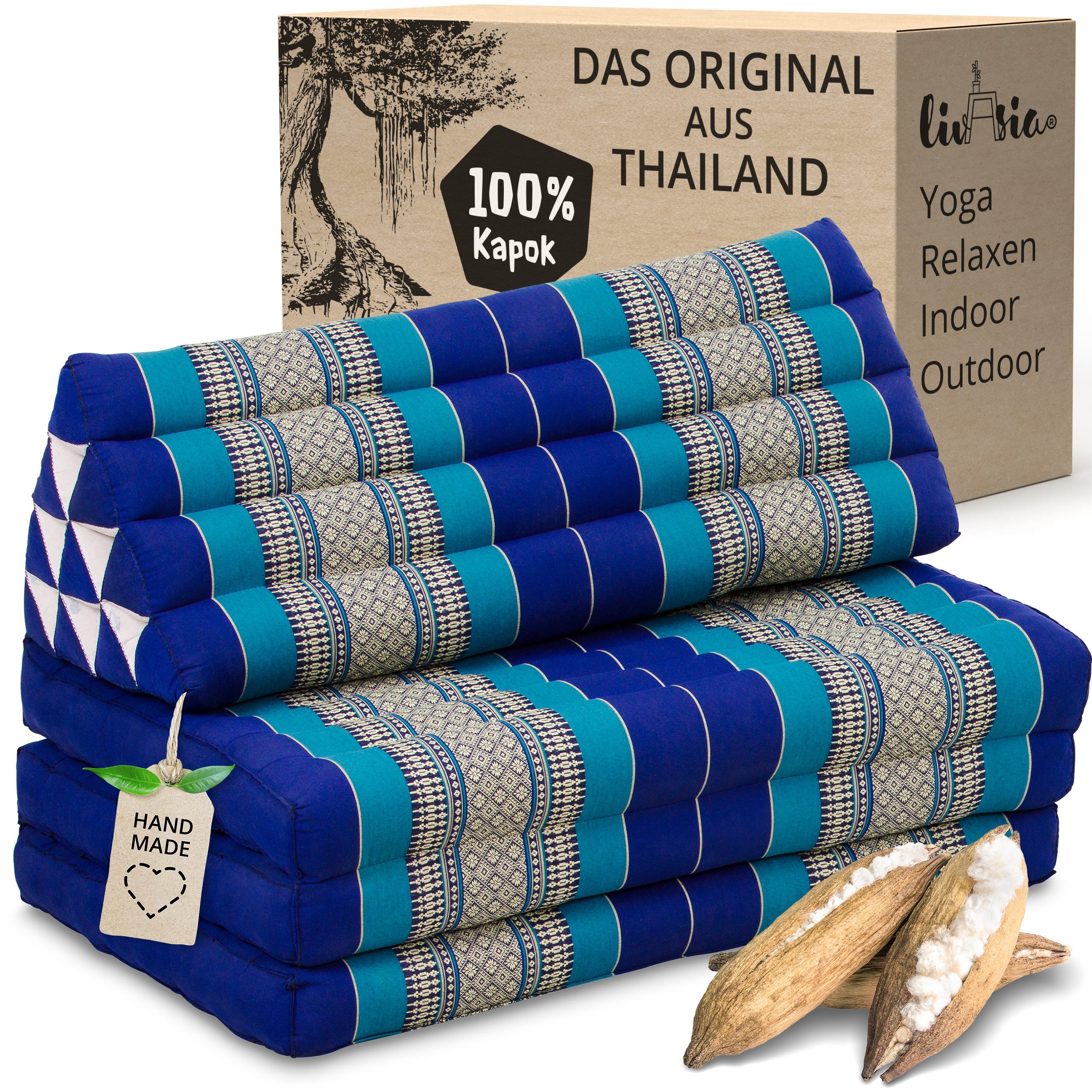 Das dreieckige Thaikissen mit drei Auflagen begeistert mit seinem fernöstlichen Design. Die farbenfrohen Kissen versprühen überall gute Laune und machen so richtig Lust, sich an einen weit entfernten, einsamen Strand zu träumen. Die Thaimatte ist einfach ausklappbar und lässt sich platzsparend zusammengeklappt in die Ecke stellen. Das formfeste Kissen besticht besonders durch seine inneren Werte: Die Füllung besteht aus feuchtigkeits- und wärmeisolierender Kapokfaser - dank ihr gestaltest du auch auf feuchtem und kühlem Untergrund eine gemütliche Liegeinsel.
