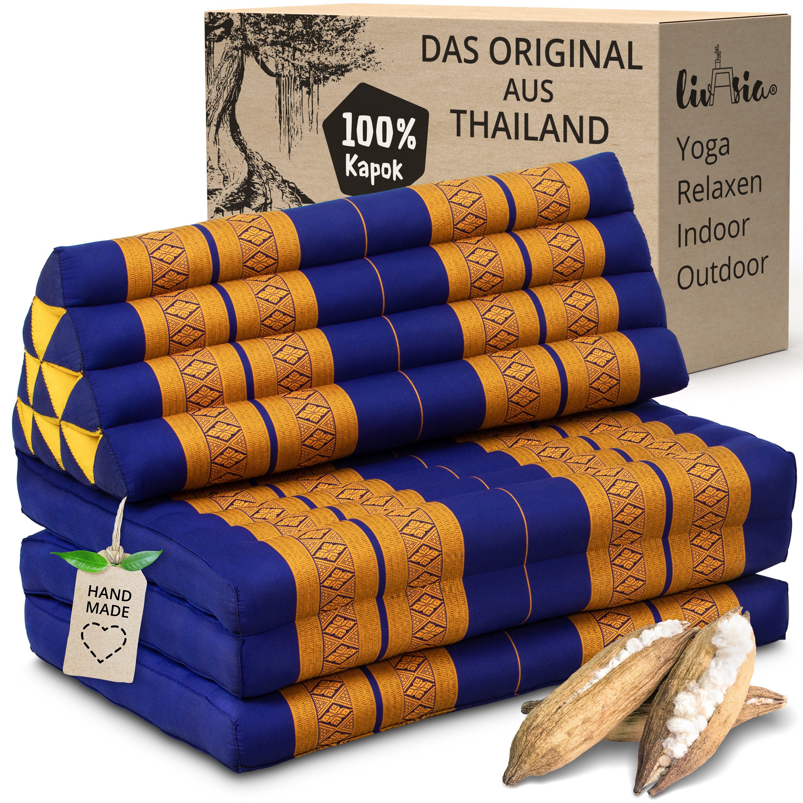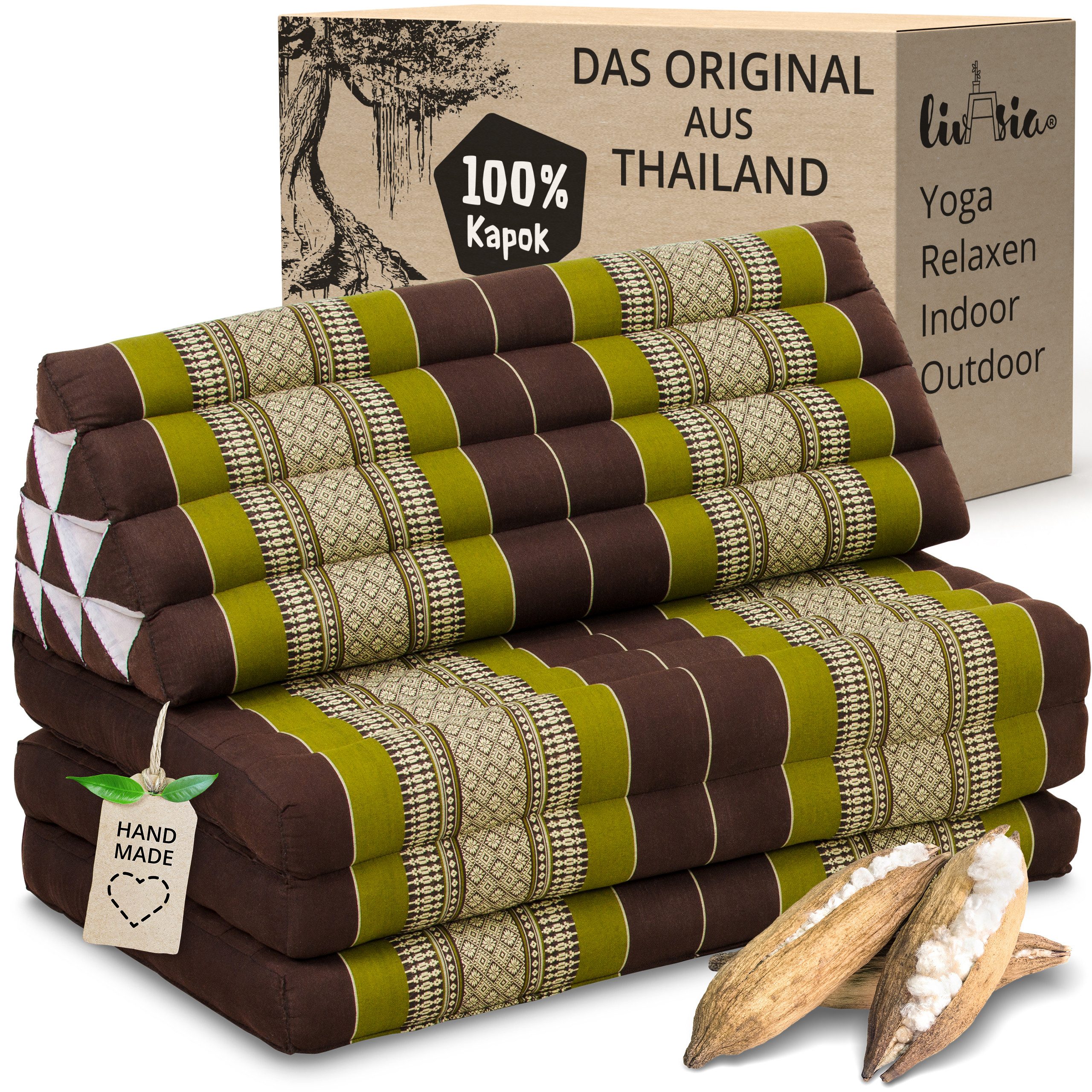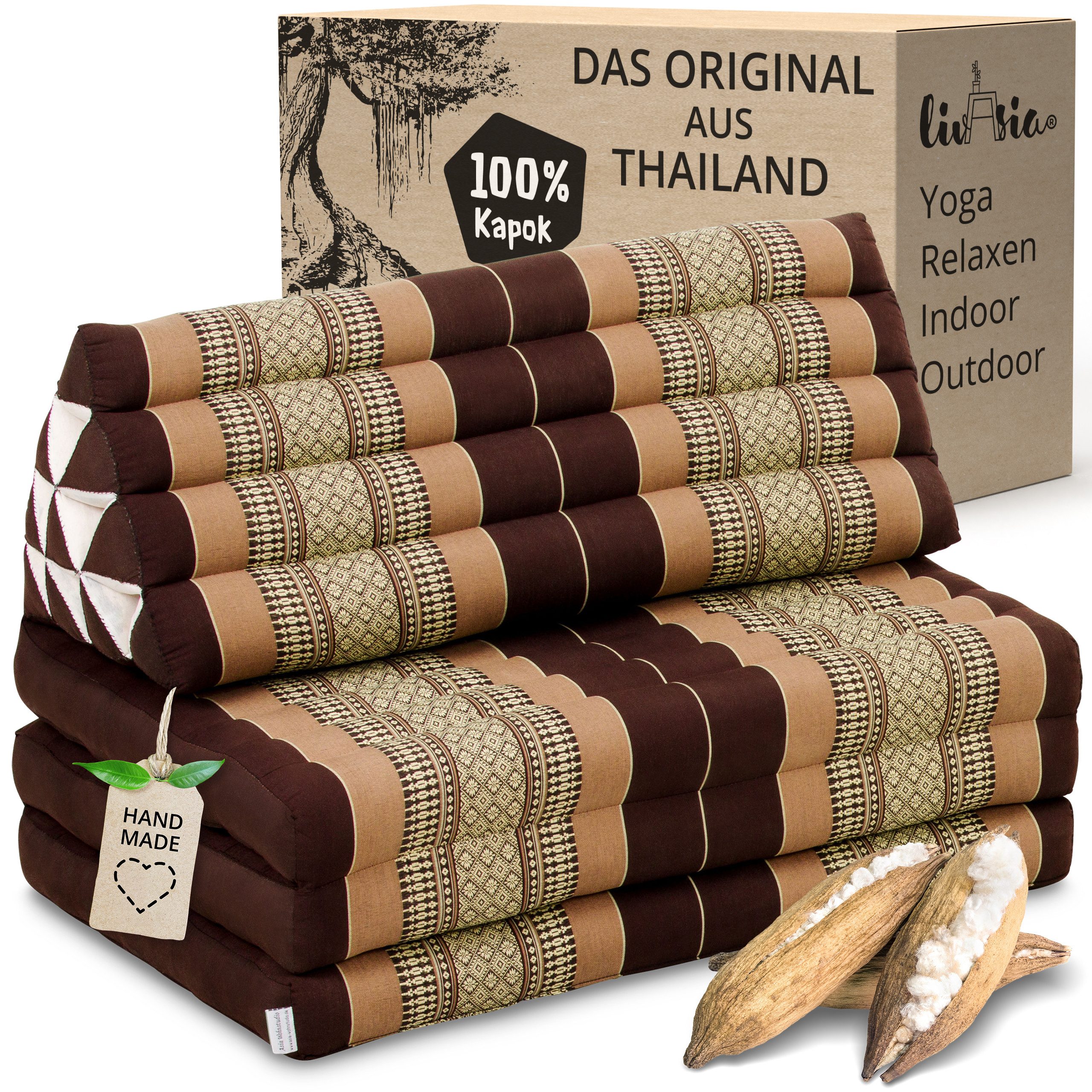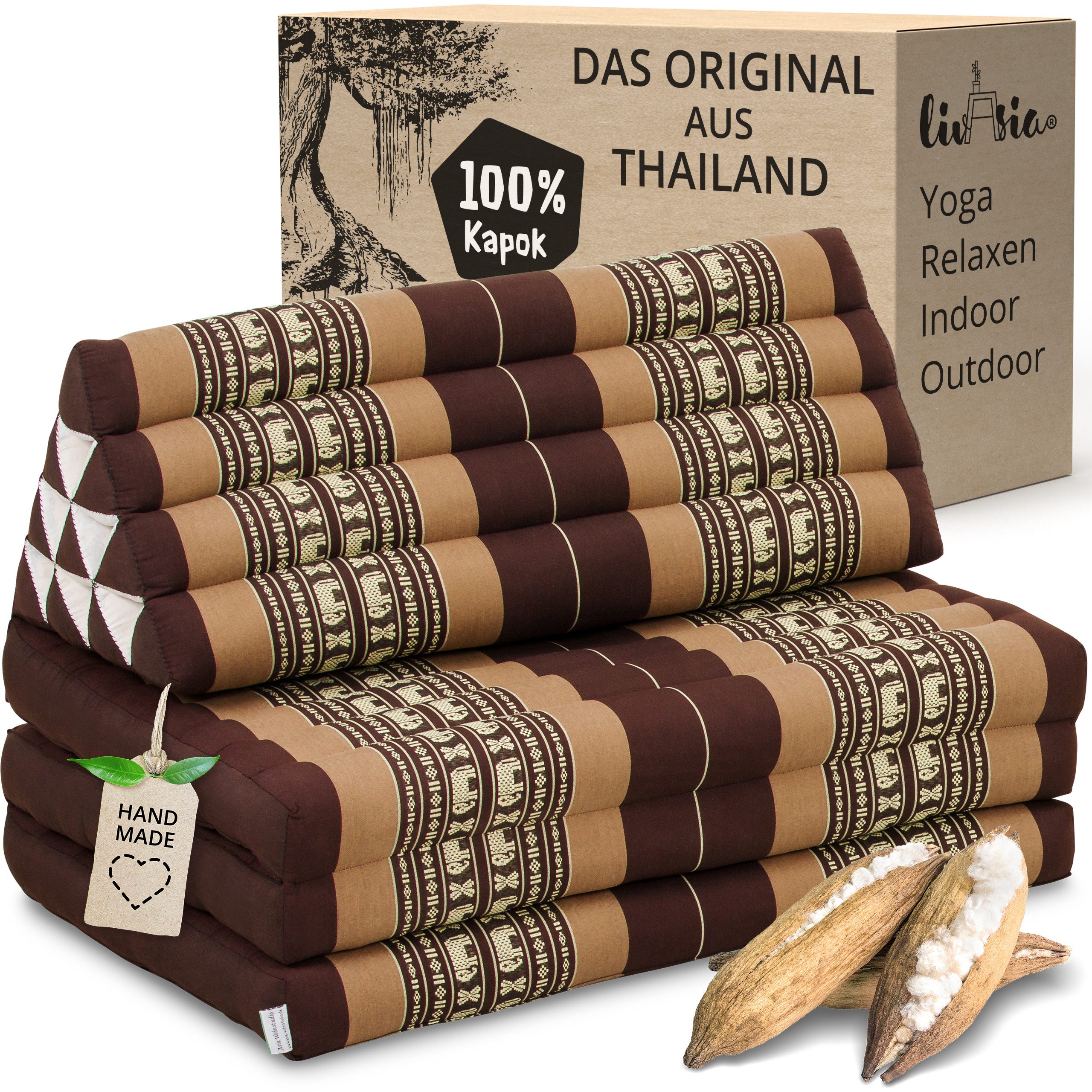 Das dreieckige Thaikissen mit drei Auflagen begeistert mit seinem fernöstlichen Design. Die farbenfrohen Kissen versprühen überall gute Laune und machen so richtig Lust, sich an einen weit entfernten, einsamen Strand zu träumen. Die Thaimatte ist einfach ausklappbar und lässt sich platzsparend zusammengeklappt in die Ecke stellen. Das formfeste Kissen besticht besonders durch seine inneren Werte: Die Füllung besteht aus feuchtigkeits- und wärmeisolierender Kapokfaser - dank ihr gestaltest du auch auf feuchtem und kühlem Untergrund eine gemütliche Liegeinsel.