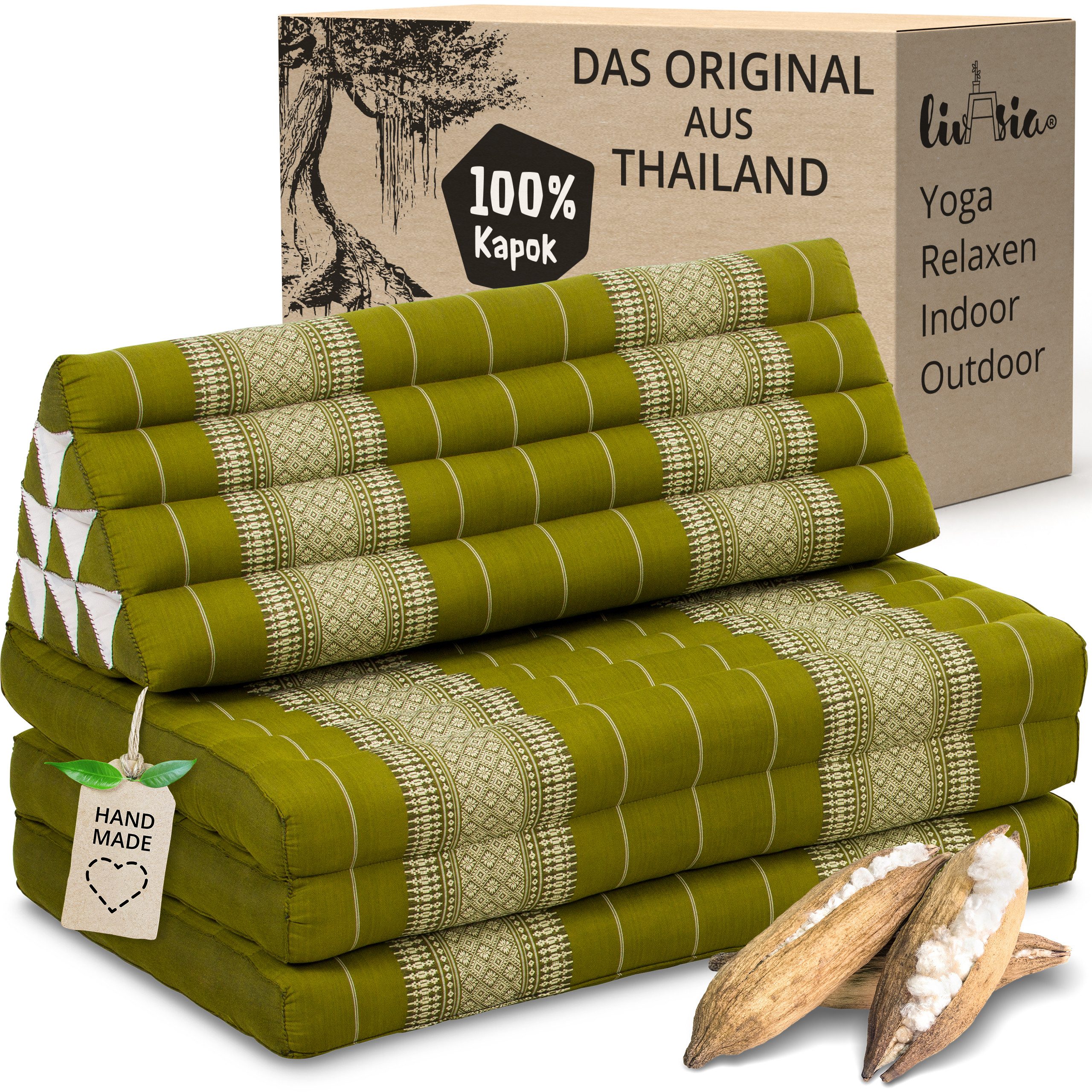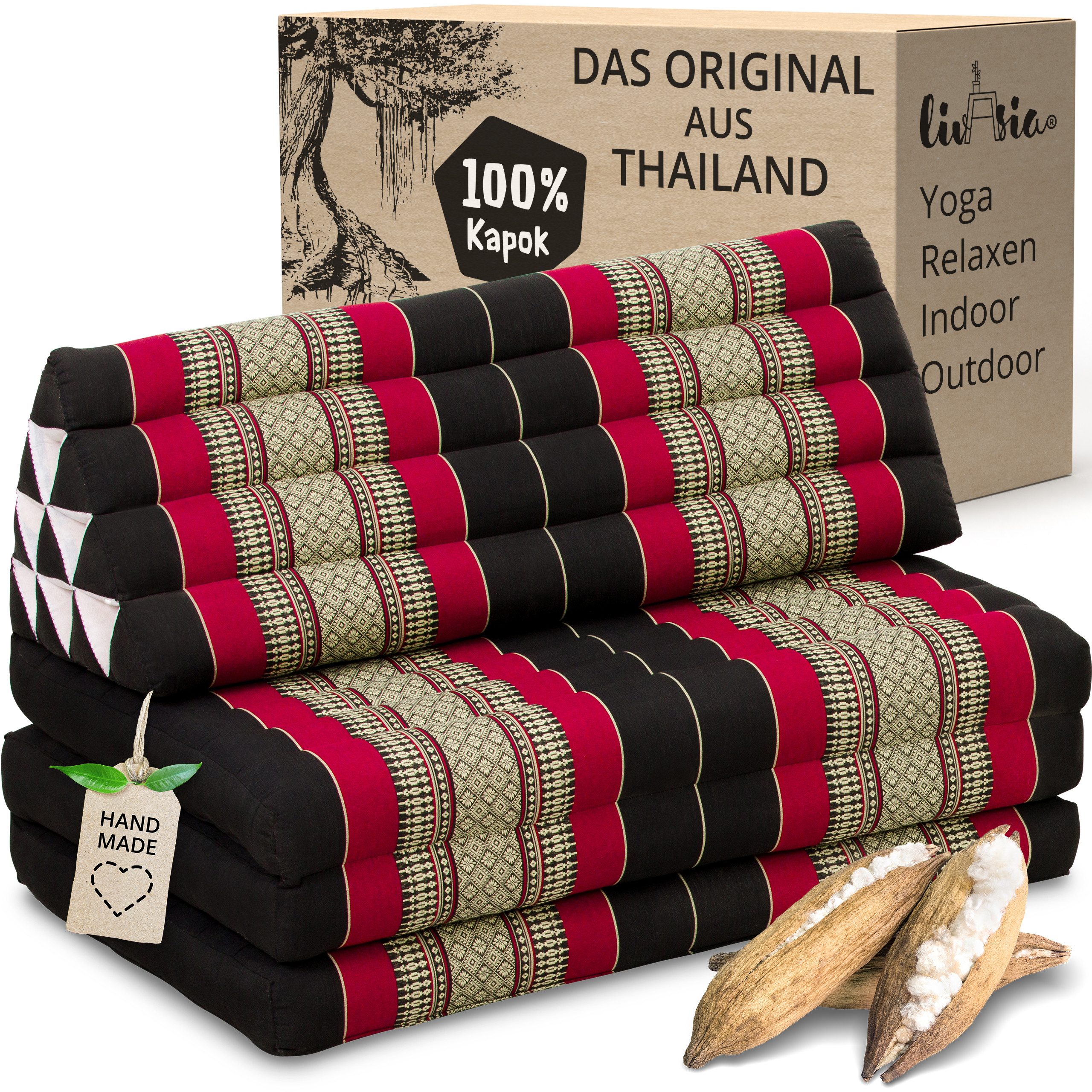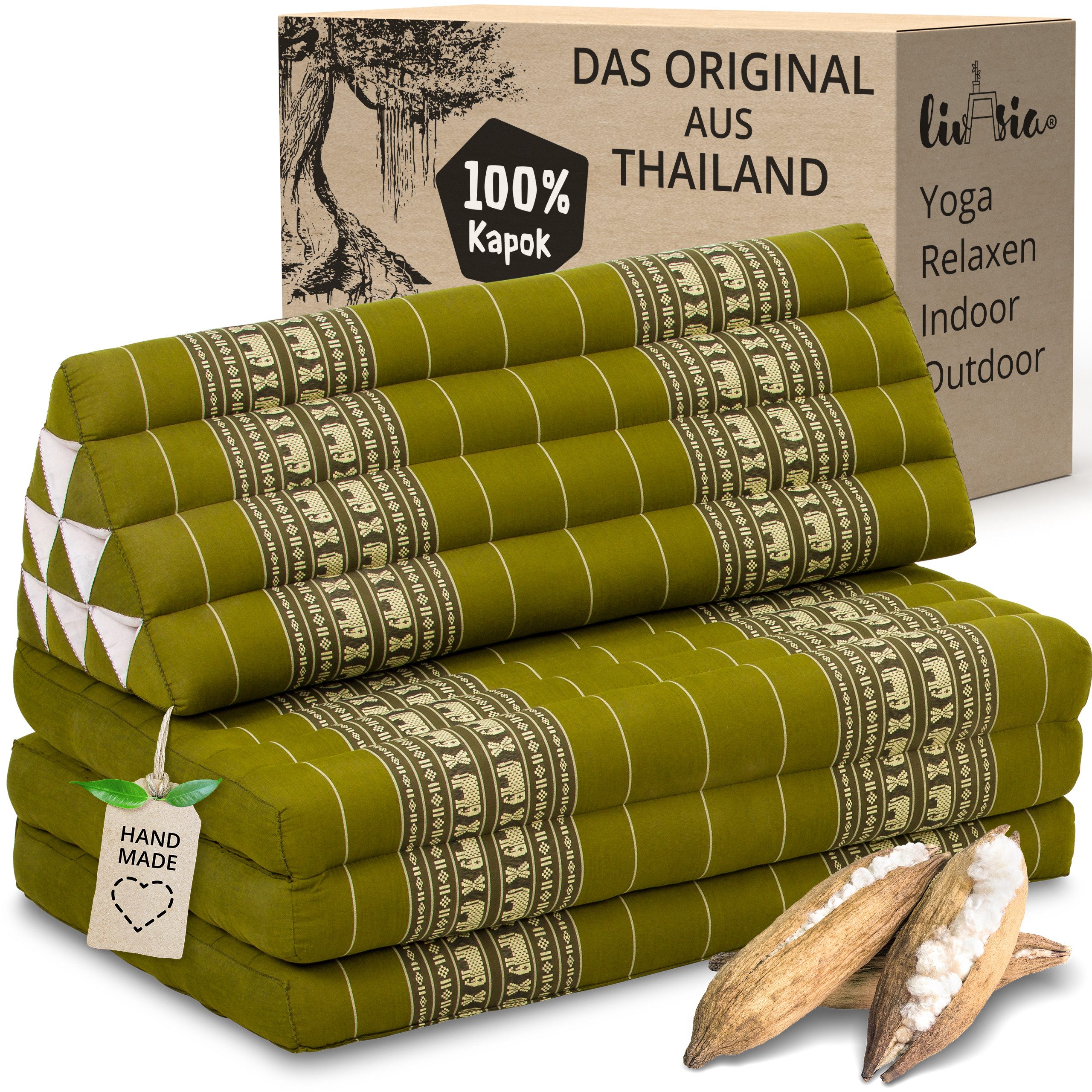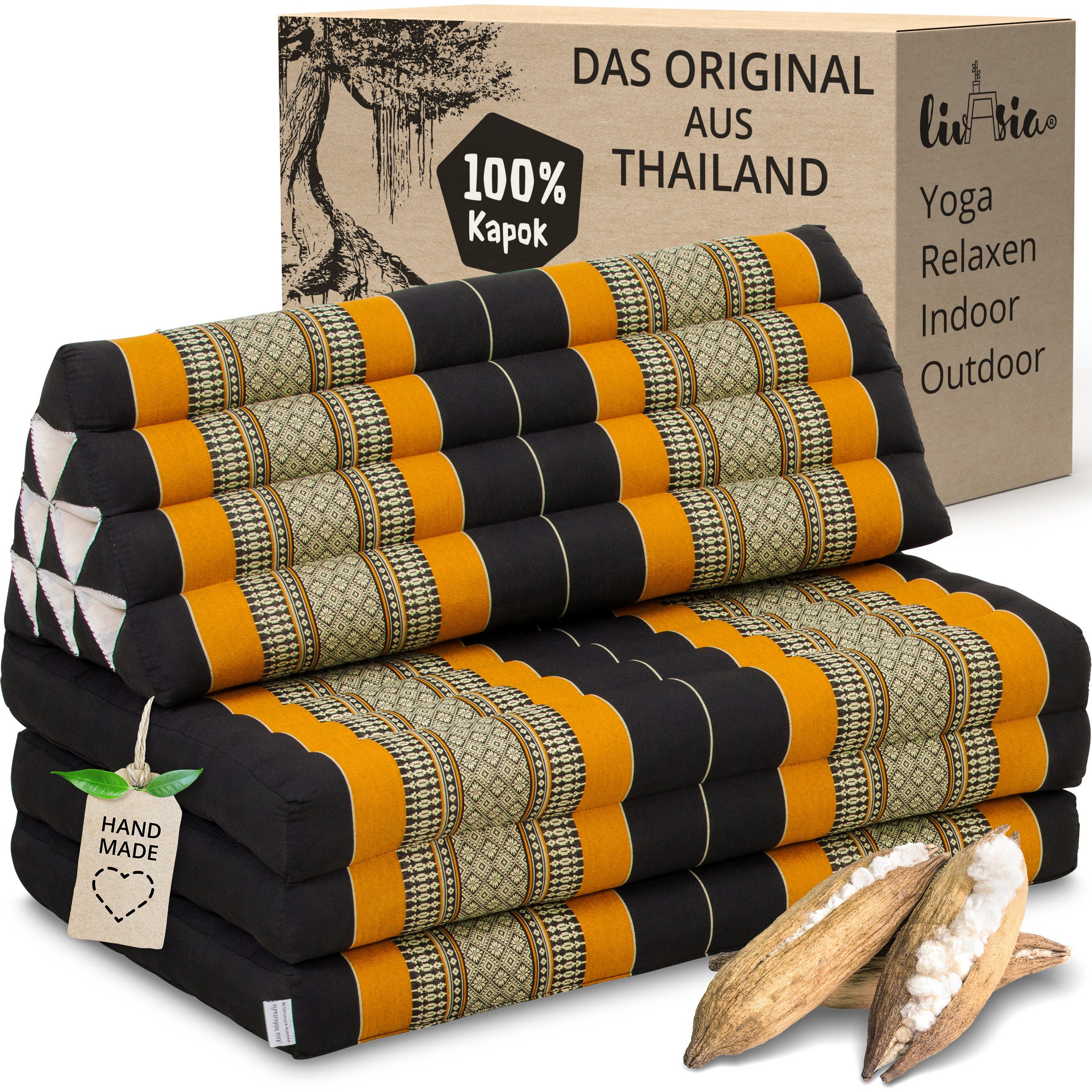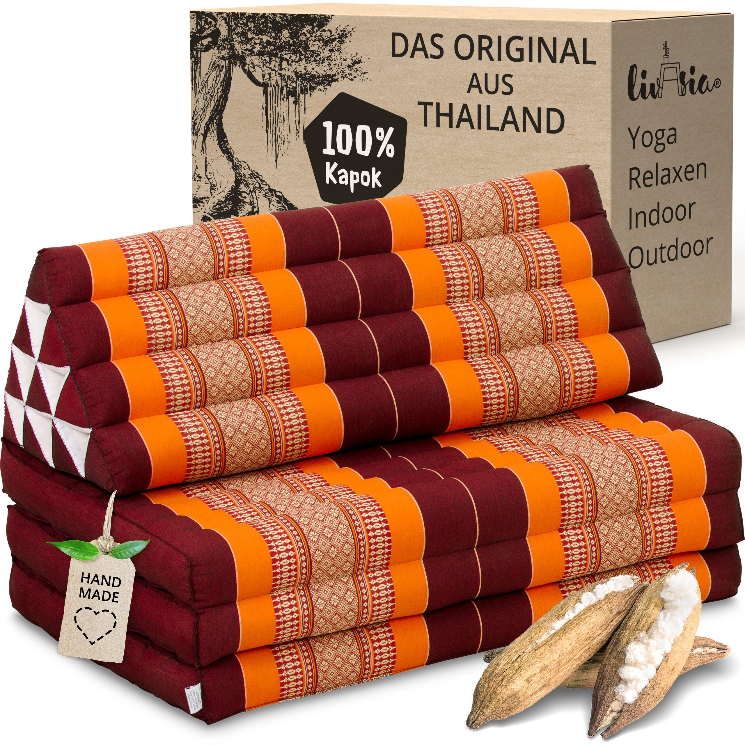 Das dreieckige Thaikissen mit drei Auflagen begeistert mit seinem fernöstlichen Design. Die farbenfrohen Kissen versprühen überall gute Laune und machen so richtig Lust, sich an einen weit entfernten, einsamen Strand zu träumen. Die Thaimatte ist einfach ausklappbar und lässt sich platzsparend zusammengeklappt in die Ecke stellen. Das formfeste Kissen besticht besonders durch seine inneren Werte: Die Füllung besteht aus feuchtigkeits- und wärmeisolierender Kapokfaser - dank ihr gestaltest du auch auf feuchtem und kühlem Untergrund eine gemütliche Liegeinsel.