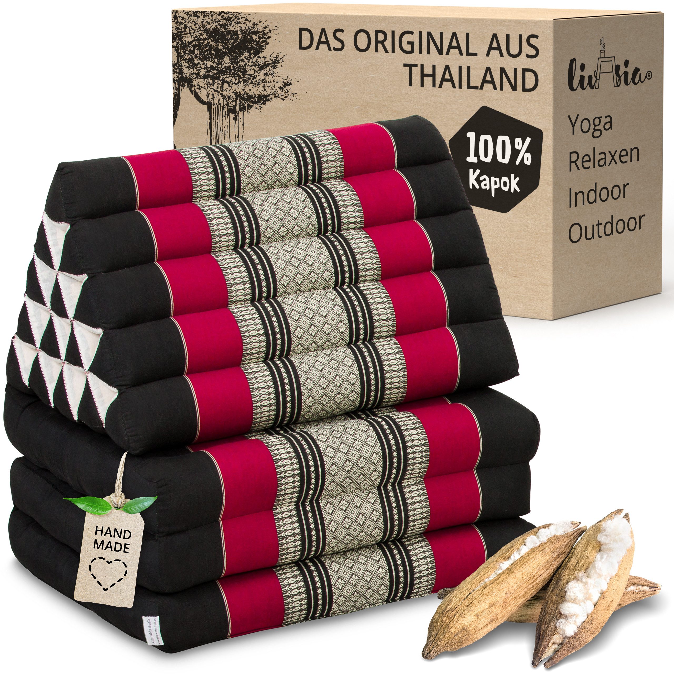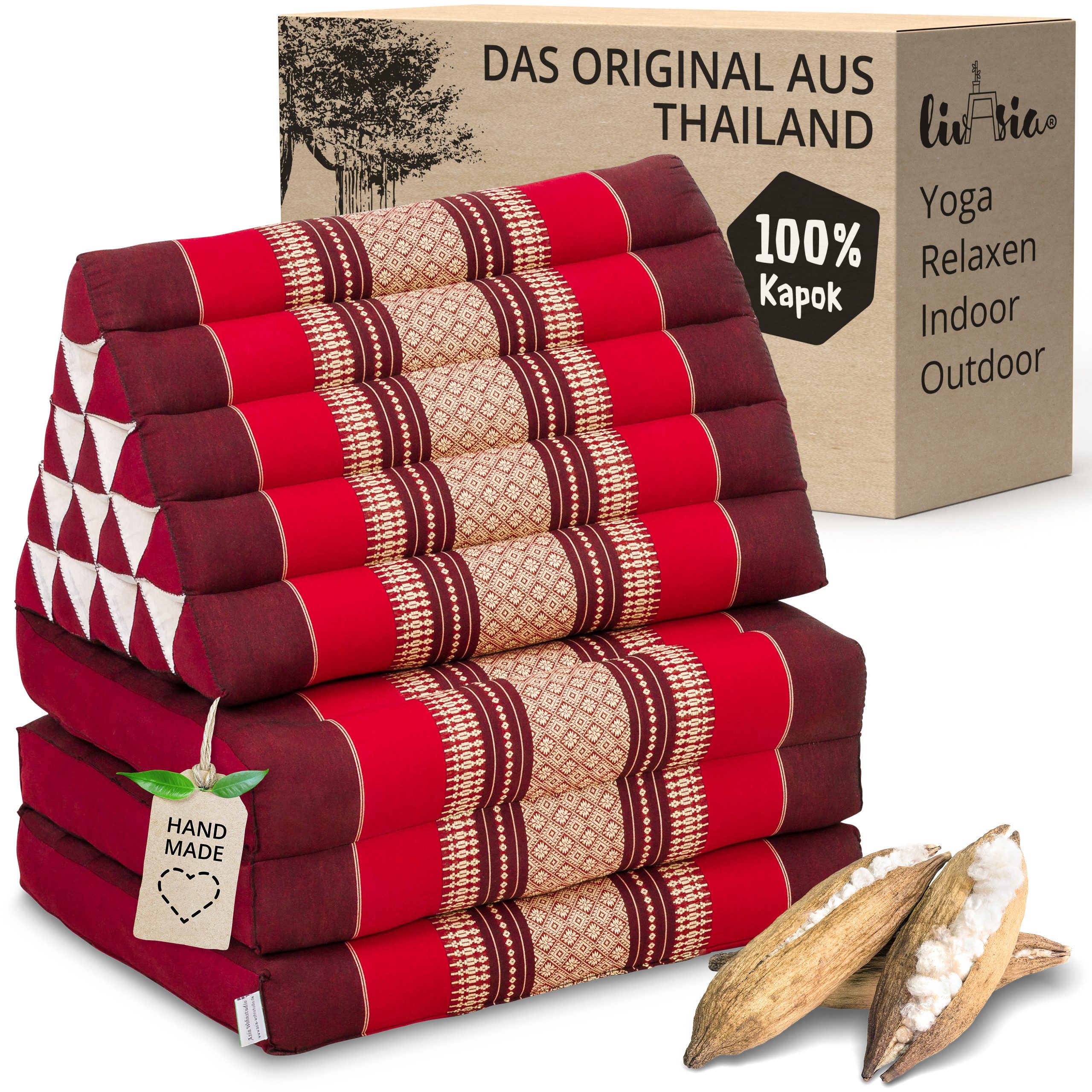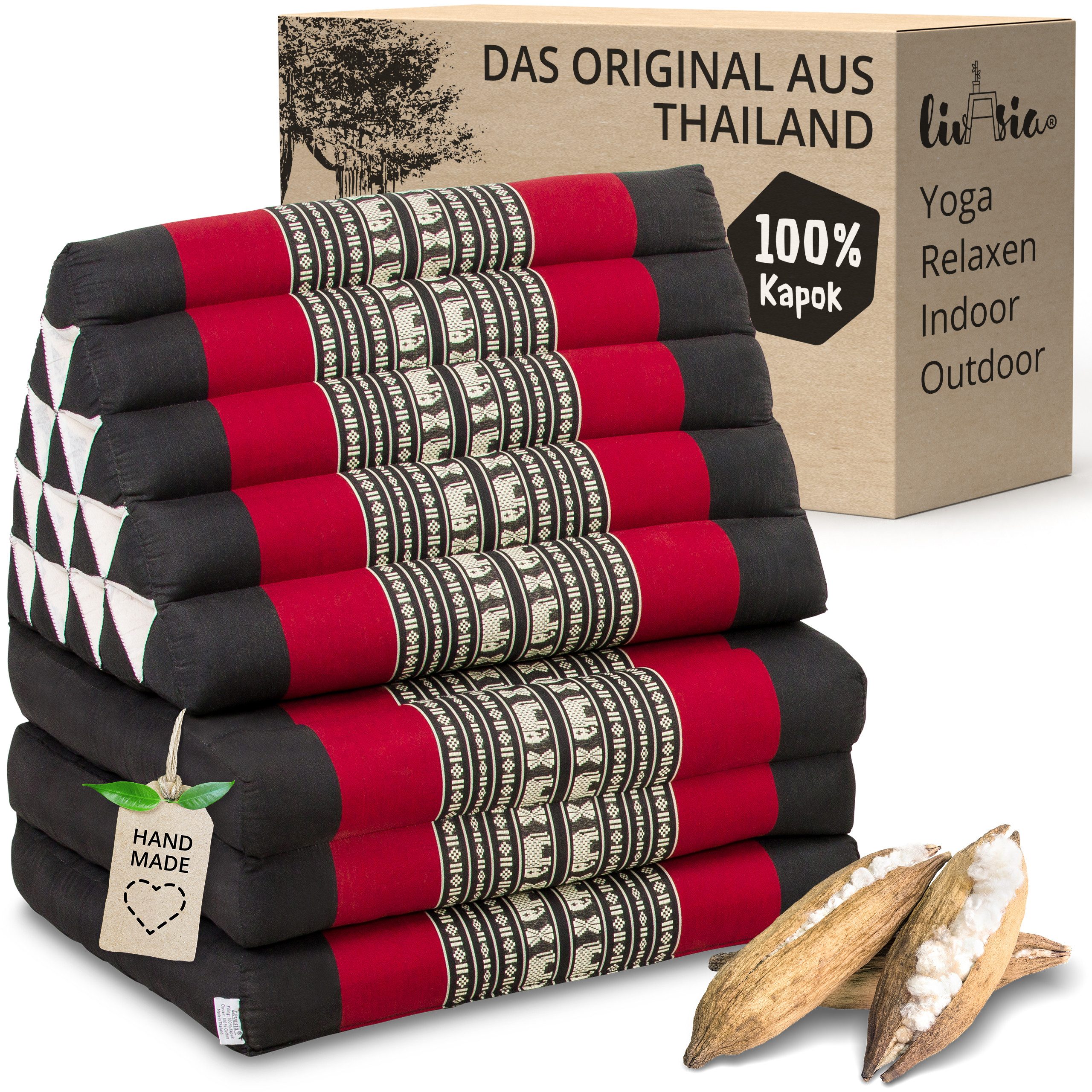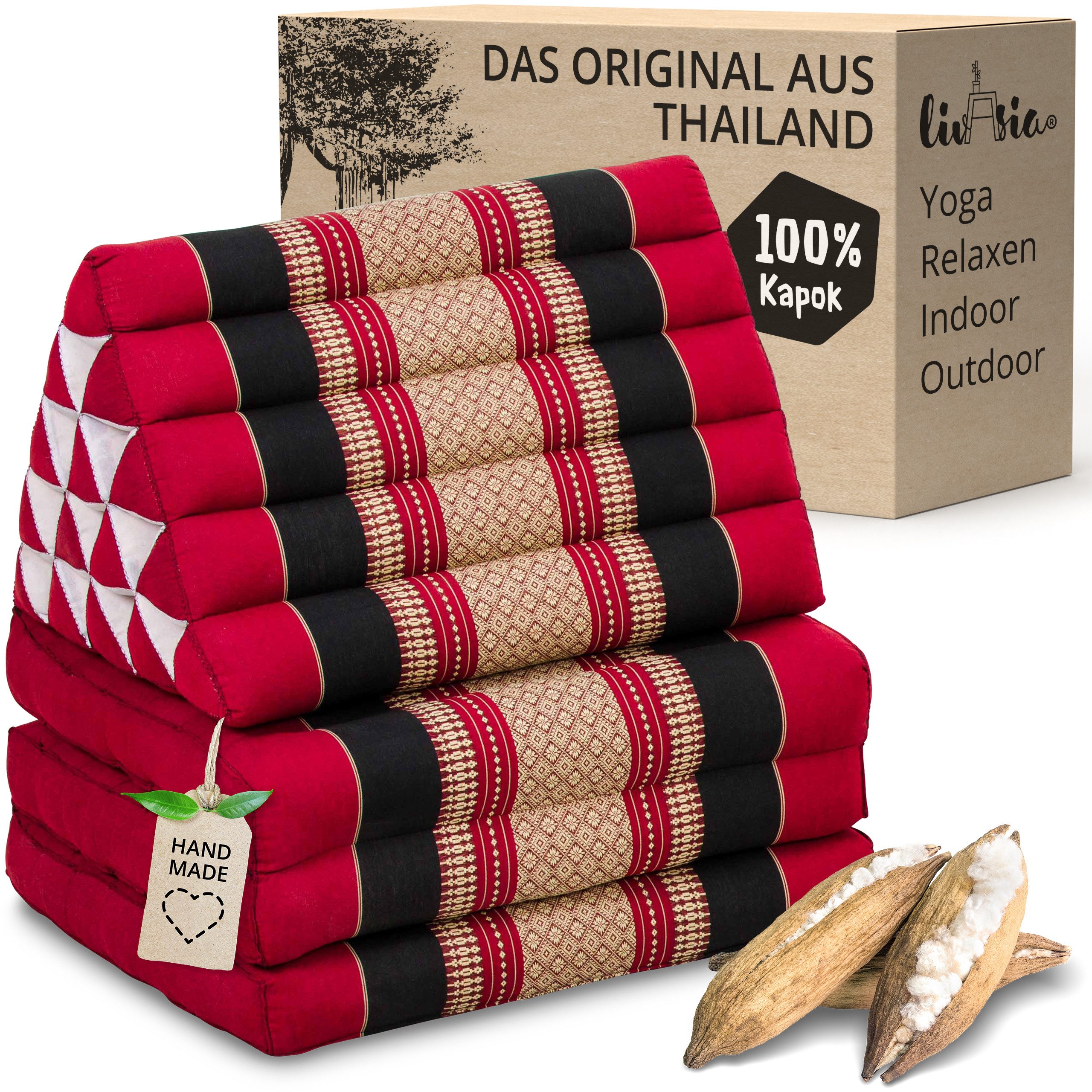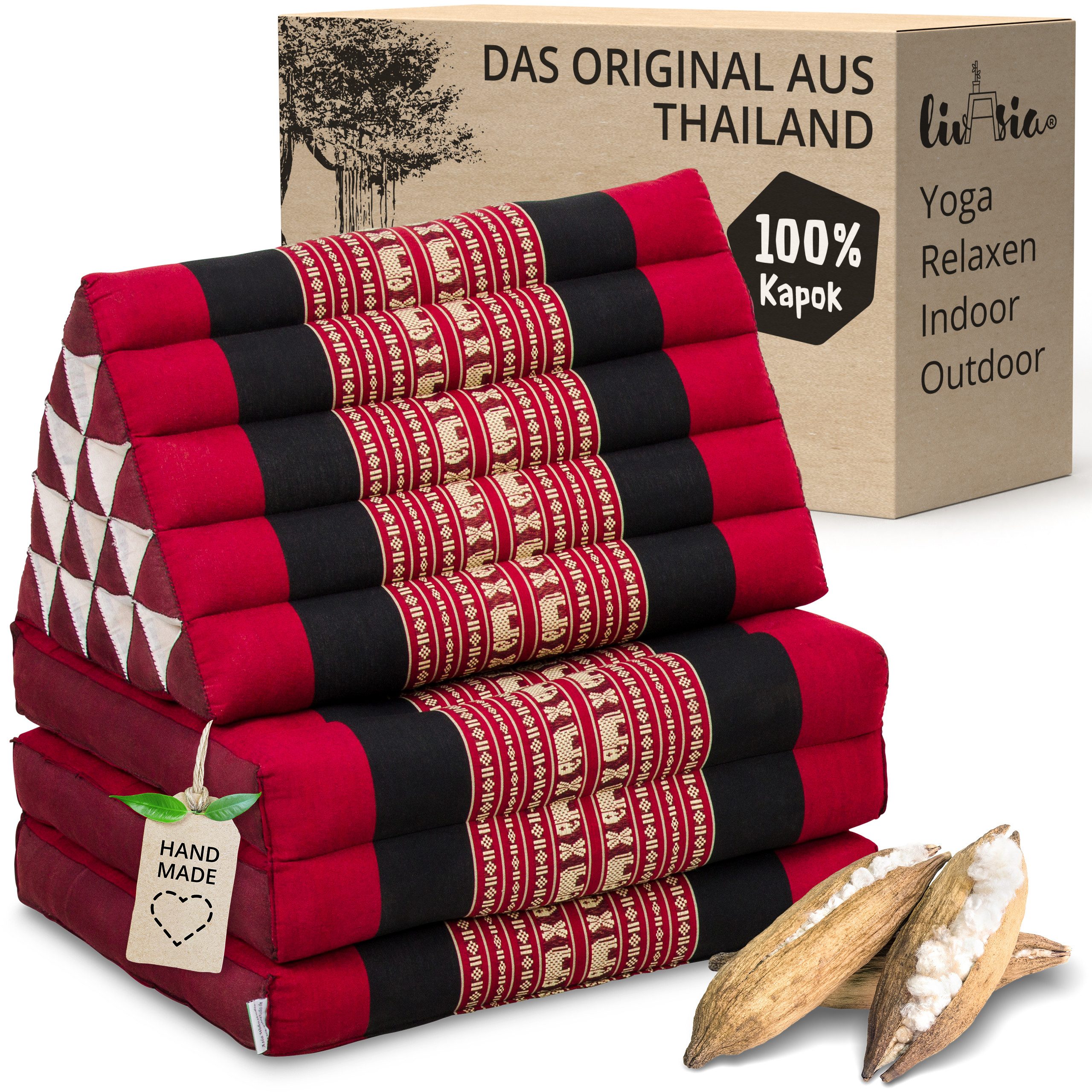 Das besondere Thaikissen beschert dir entspannende Zeiten. Lasse den Alltag hinter dir und lehn dich zurück. Die extrahohe Rückenlehne erzeugt eine Luxus-Ruheoase, in der du gemütlich ein Buch lesen, Fernsehen, die Beine nach einem langen Tag ausstrecken oder Meditieren kannst. Schnell ist das Thaikissen mit XXL-Höhe aufgeklappt und eröffnet deine Lieblingsecke – egal, wo du gerade bist. Das hohe Dreieckskissen lässt sich platzsparend aufbewahren und begeistert nicht nur Minimalisten – auch Asien-Fans und Reiselustige bekommen Fernweh, wenn sie auf den bequemen Kissen Platz nehmen.