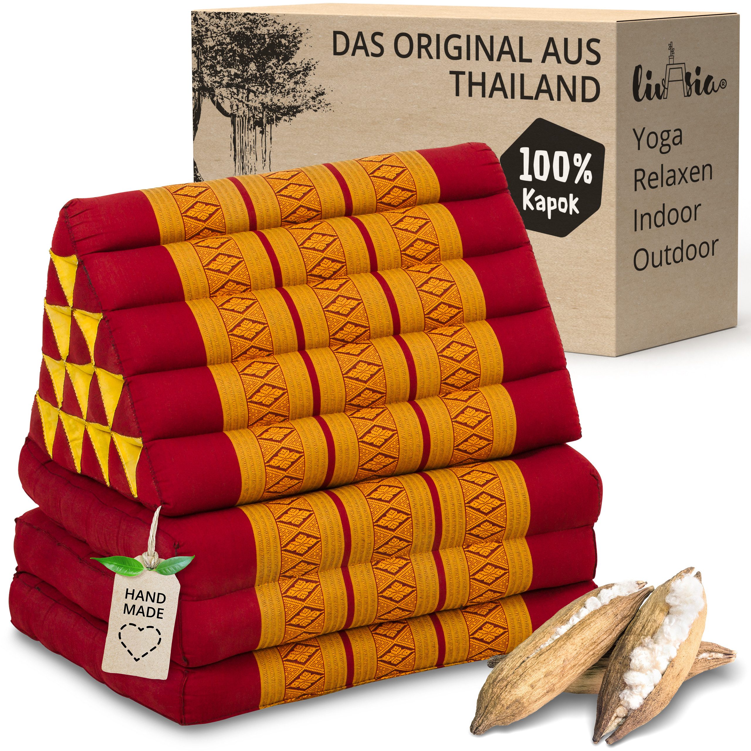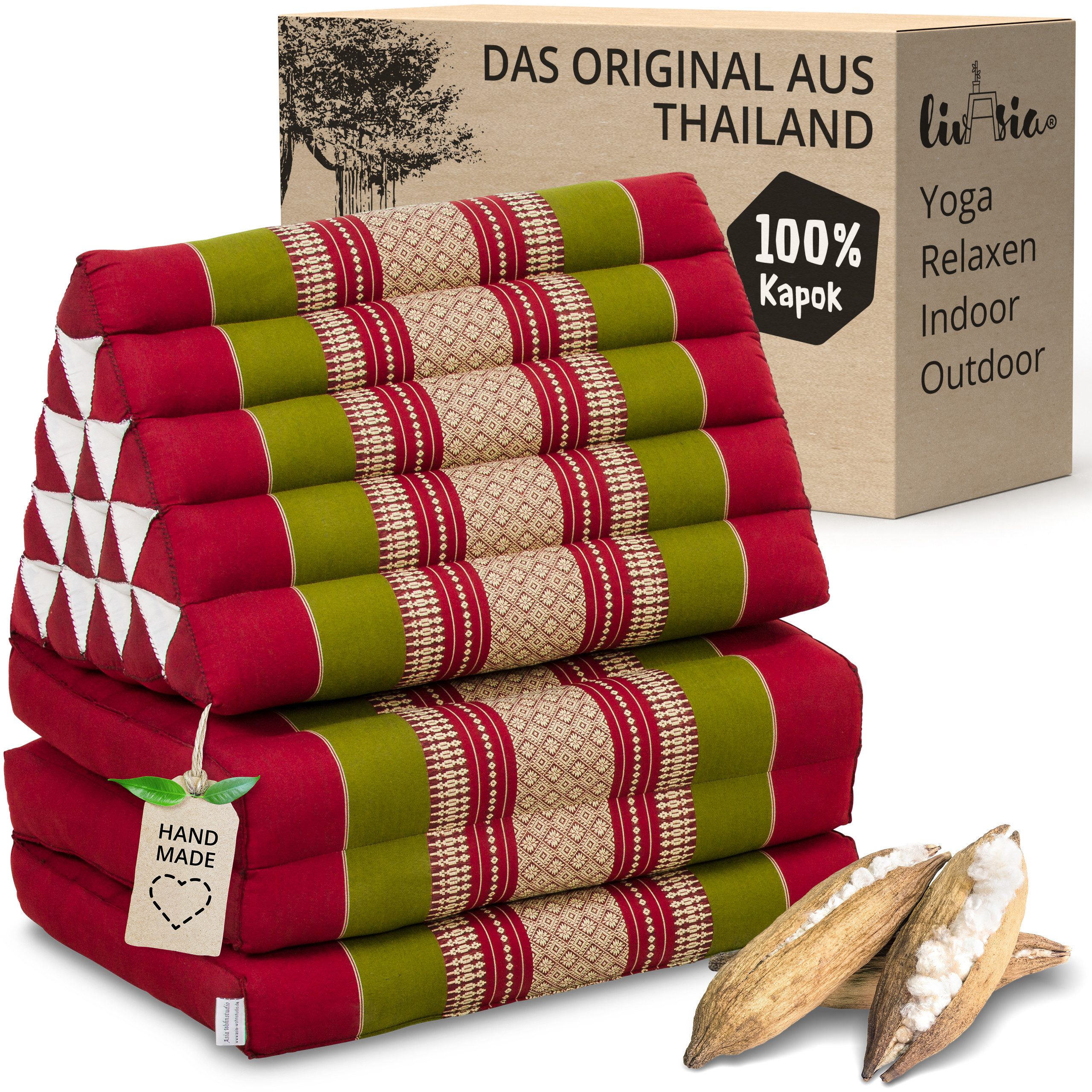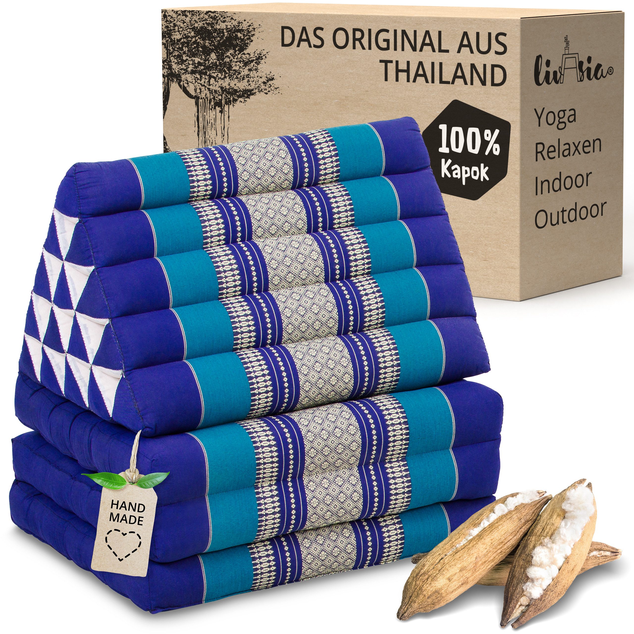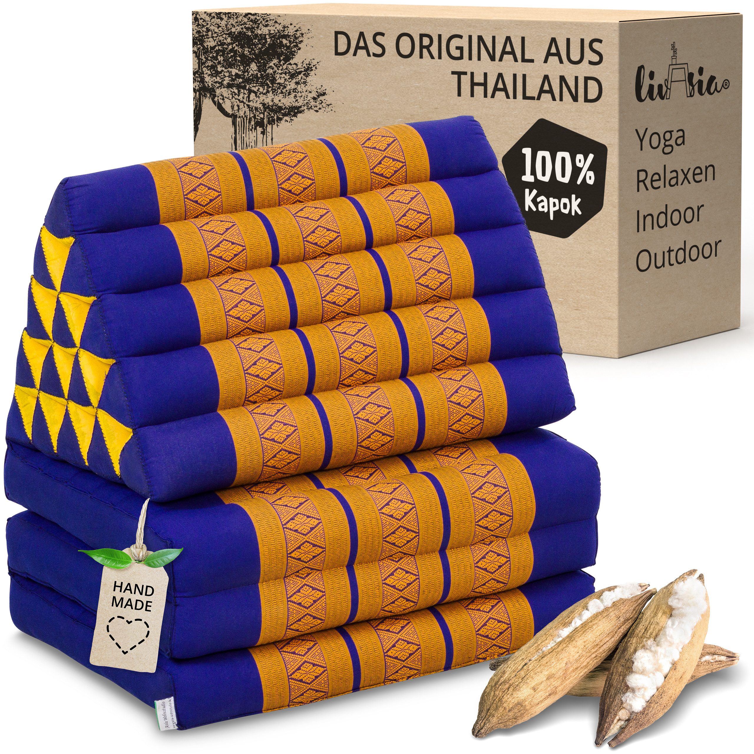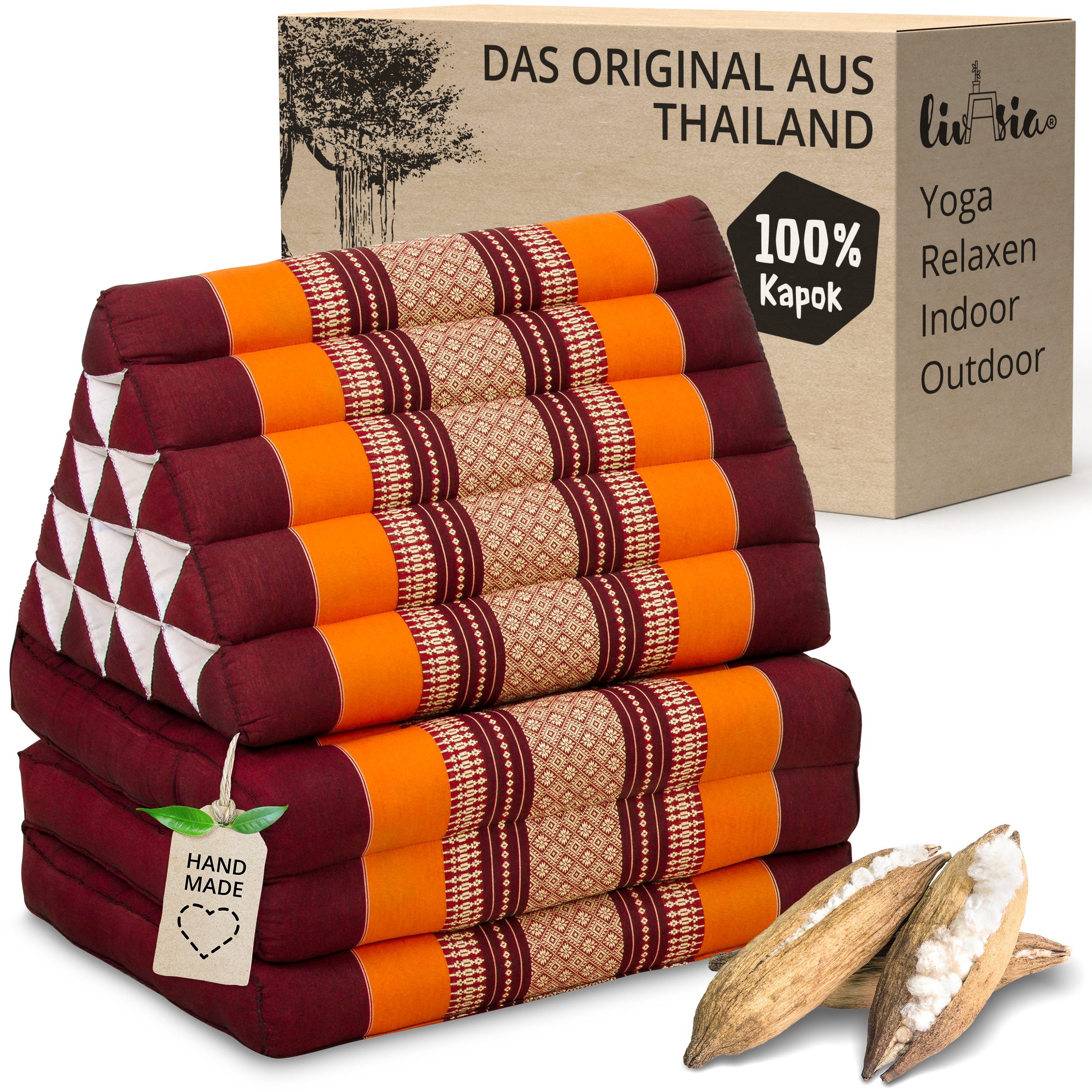 Eine Runde Meditieren, um wieder ganz bei dir zu sein. Eine revitalisierende Yoga-Einheit oder die Seele baumeln lassen nach einem stressigen Tag. Den sonnigen Tag im Garten genießen und die Gedanken zu weit entfernten Traumorten schweifen lassen. Das Thaikissen in XXL-Höhe begleitet den Alltag in deinen vier Wänden – und darüber hinaus. Das faltbare Dreieckskissen ist mit drei Auflagen ausgestattet, diese spenden Gemütlichkeit. Du kannst deine Beine ausstrecken und relaxen. Nutzt du das Thaikissen in XXL-Höhe als Bodensofa, finden auch deine Gäste hier ein komfortables Plätzchen. Auch draußen auf dem Balkon und im Garten sorgt das farbenfrohe Kissen mit klassischen Thai-Stickereien für Fernweh, denn die Füllung aus naturbelassenem Kapok ist feuchtigkeitsresistent und hält Bodenkälte fern.