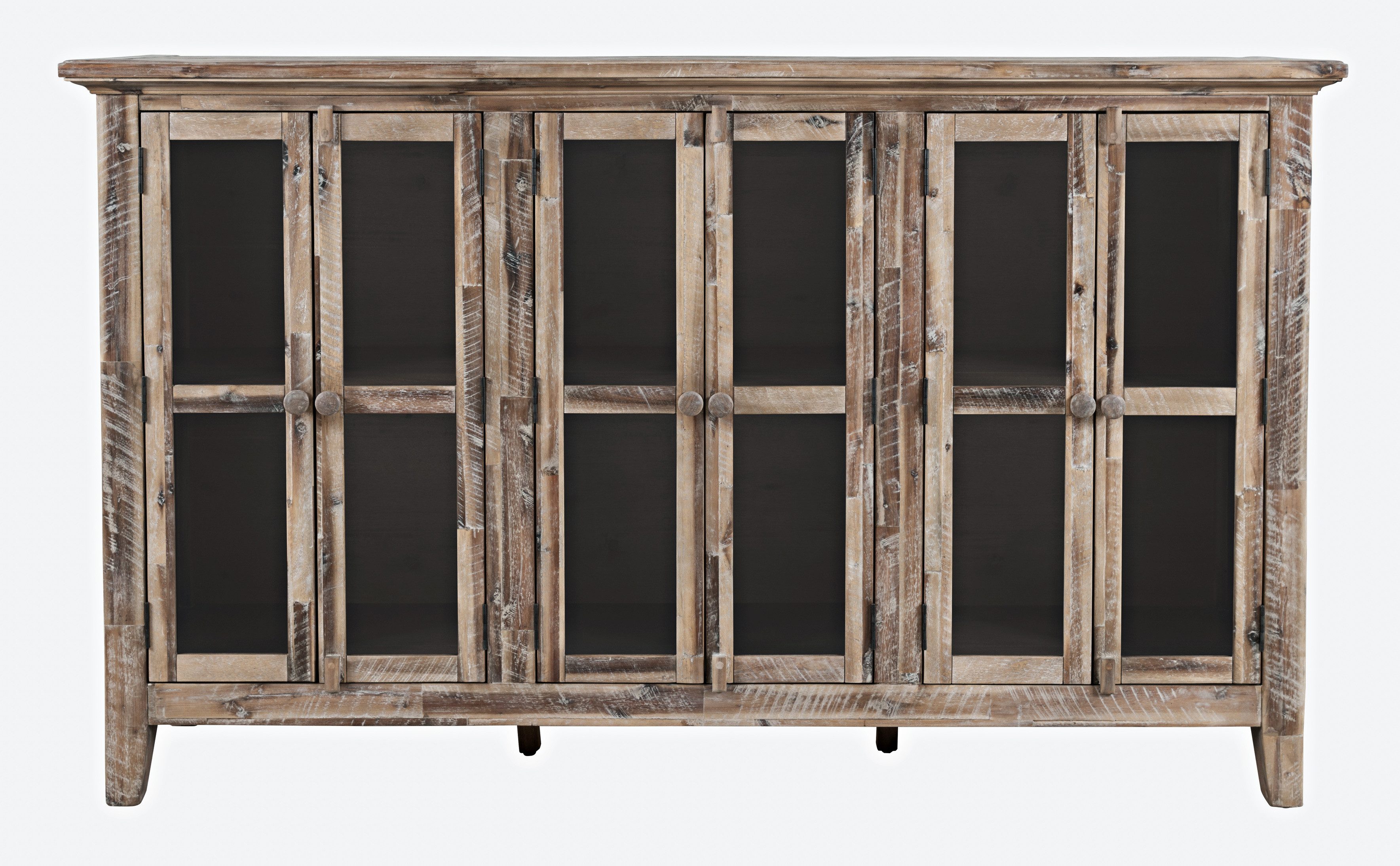Die Kommode ist aus hochwertigem Akazienholz und Furnierholz gefertigt, was sie besonders stabil und langlebig macht. Die gefräste Platte sowie die verglaste Tür unterstreichen den rustikalen Charme des Möbelstücks.