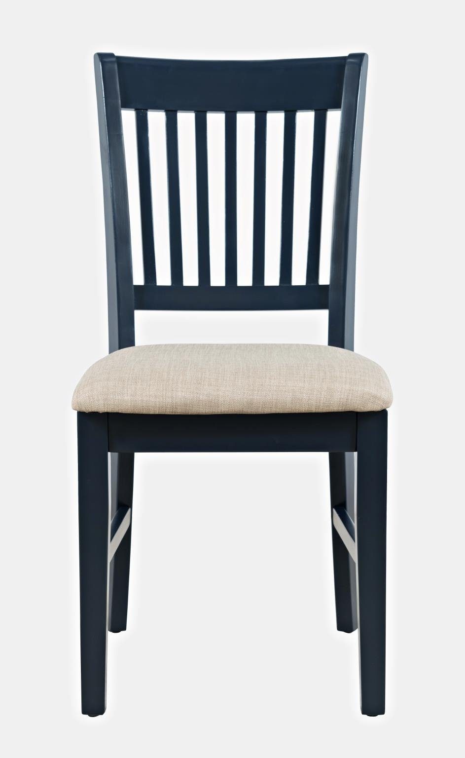 Wir präsentieren Ihnen einen eleganten, dunkelblauen, gepolsterten Stuhl aus der Avola Kollektion. Dieser Stuhl besticht durch sein schlichtes, dennoch auffälliges Design. Die Rückenlehne mit vertikalen Latten bietet einen schönen Kontrast zu dem cremefarbenen, gepolsterten Sitz und verleiht dem Stuhl einen einzigartigen Charme.