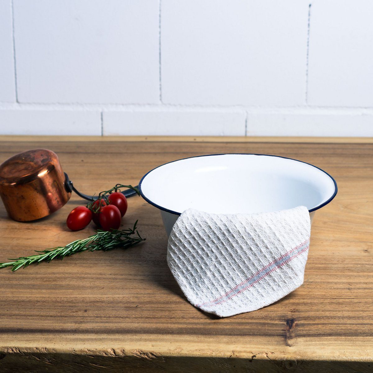 Home Spültücher, 3er-Pack "HANNOVER": Эко-товарe Alltagshelfer fu?r einen umweltschonenden Abwasch: Diese klassisch gestalteten Spültücher im praktischen 3er-Pack sind eine hervorragende Wahl, wenn Sie auf ökologische Haushalttextilien umsteigen möchten. Das saugstarke Baumwoll-Polyeste r-Gewebe wird aus recycelten Fasern hergestellt und überzeugt mit seiner griffigen Waffelstruktur und hohen Strapazierfähigkeit. Das traditionelle Design mit dem rot-blauem Streifen macht das Spültuch auch optisch zum attraktiven Abwaschhelfer.