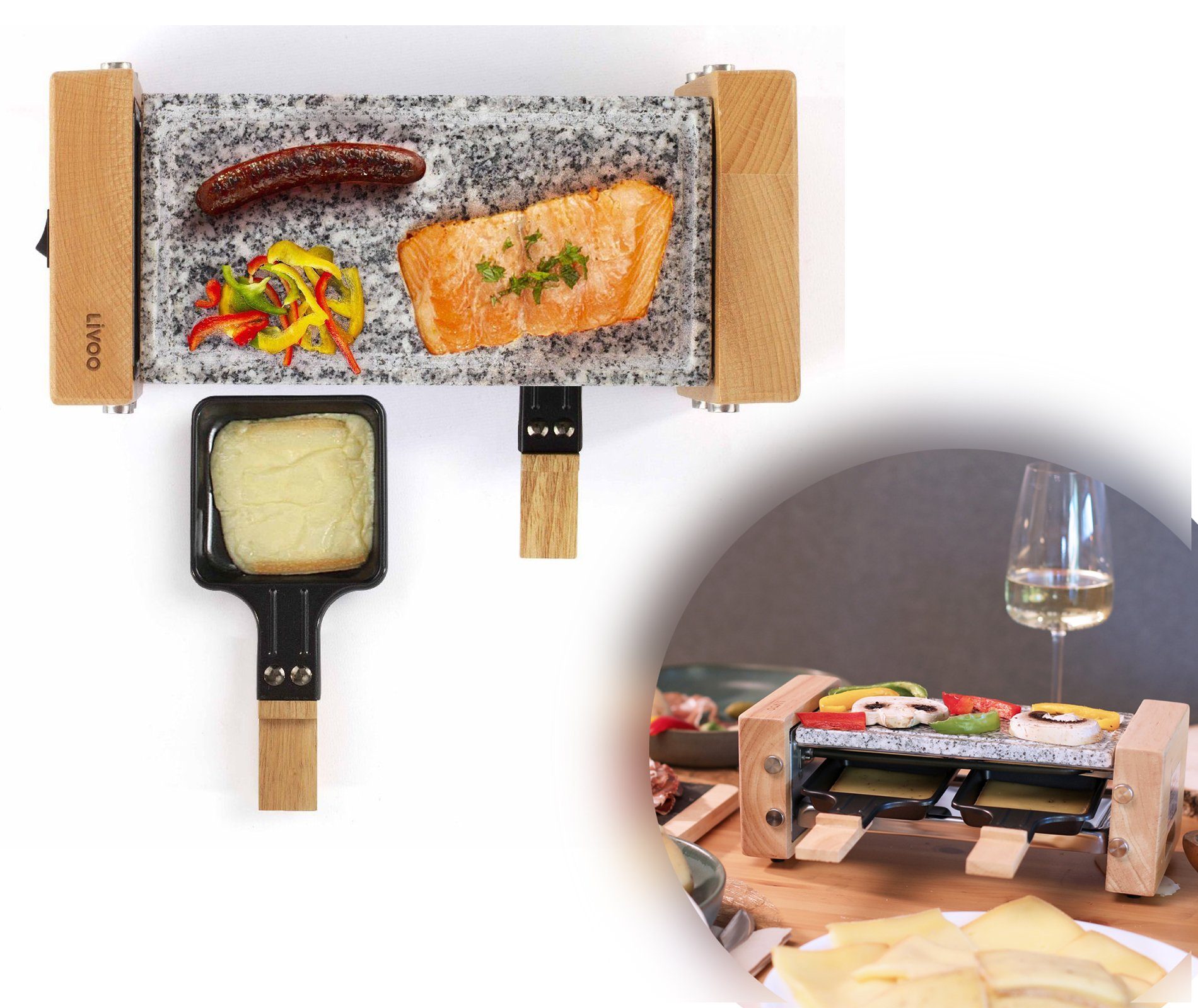 Hübscher kleiner Raclettegrill zum Essen mit zwei Personen. Der Grill besteht aus echtem Holz mit einer abnehmbaren Granitplatte. Der Grill wird inklusive zwei Raclettepfannen geliefert, die Holz Griffe haben, damit das Raclettevergnügen starten kann.