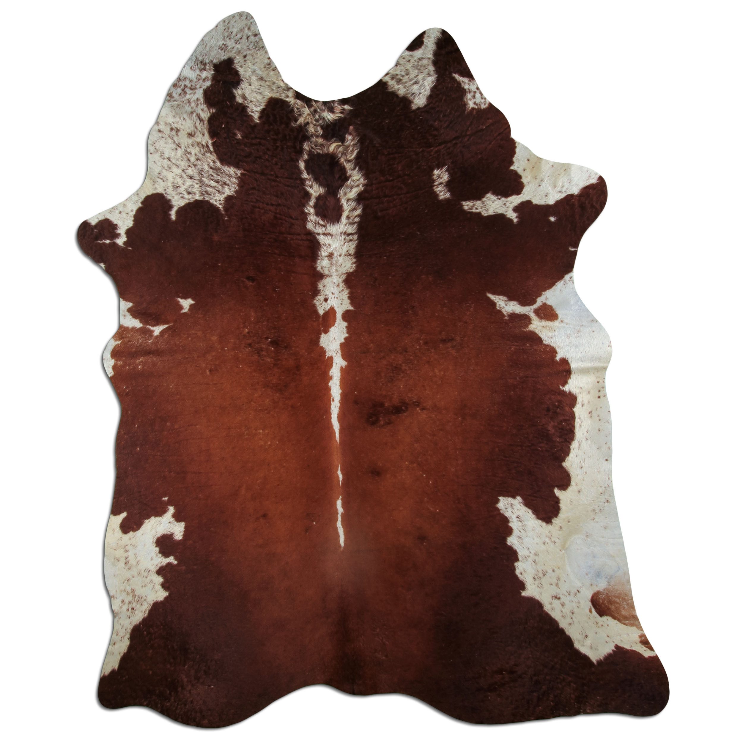 Ein Kuhfell mit tiefem Rotbraun in der Mitte, das zu den Rändern hin in Weiß übergeht. Es wirkt besonders kontrastreich und lebendig – perfekt als Eyecatcher im Raum.