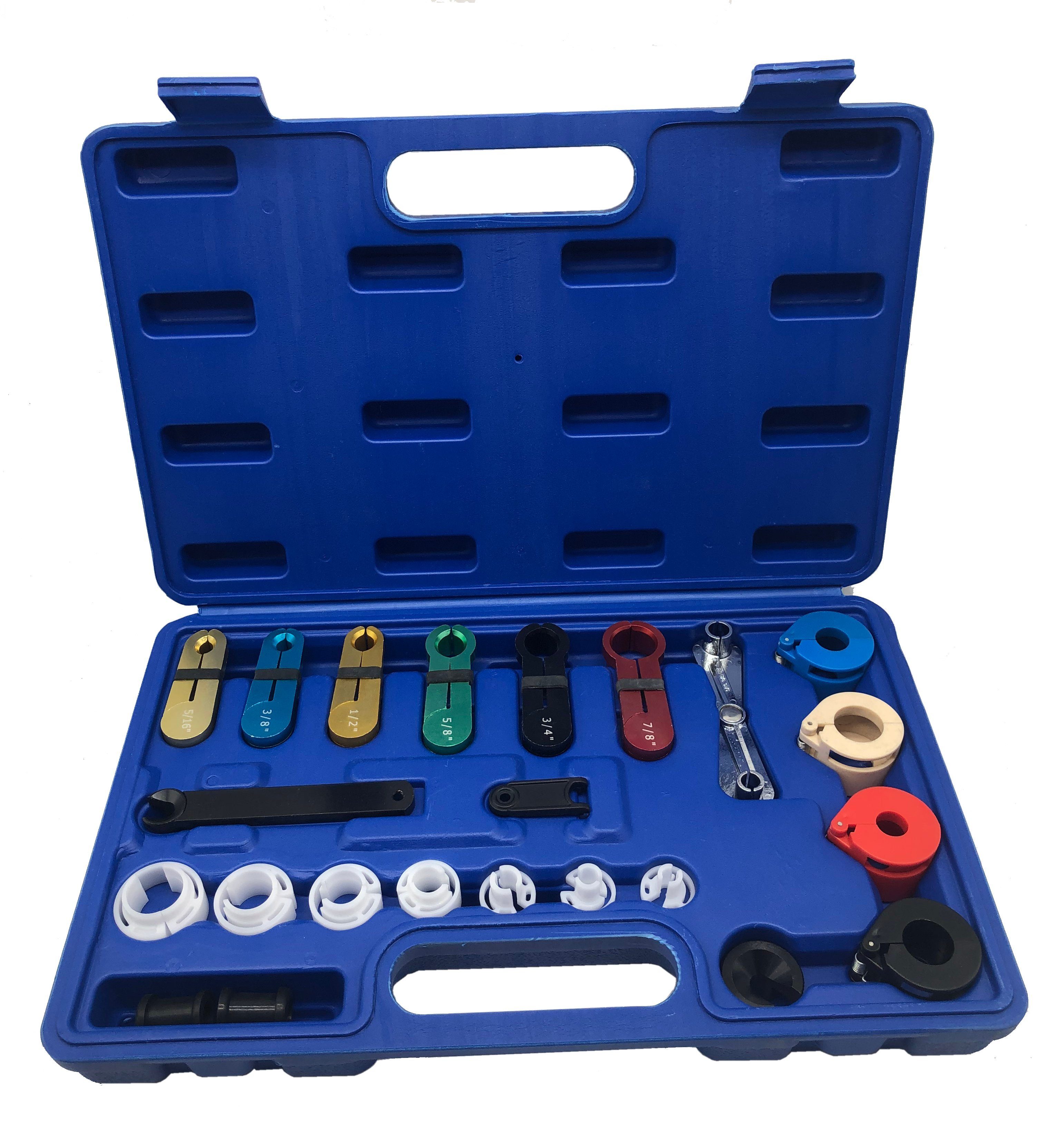 Demontage- und Entriegelungswerkzeuge für schwer zu öffnende Leitungskupplungen, zum Öffnen der Leitungskupplungen bei Klimaanlagen, Kraftstoff- und Luft-, sowie Hydraulikleitungen. 6 Scheren Entriegelungswerkzeuge aus Metall für Leitungen 5/16", 3/8", 1/2", 5/8", 3/4" und 7/8". 4 Kunststoff Feder Entriegelungswerkzeuge Spring-Lock aus Kunststoff für Leitungen 3/8", 1/2", 3/4" und 5/8" 7 Leitungsverbinder Löseclips für Schnellverschluss-Kupplungen für Leitungen 1/4", 5/16", 3/8", 1/2", 5/8", 3/4" und 7/8" 1 Scheren Entriegelungswerkzeug aus Metall für Leitungen 5/16" und 3/8", 2 Hebel Entriegelungswerkzeuge, 1 offener Entriegelungsring aus Metall.