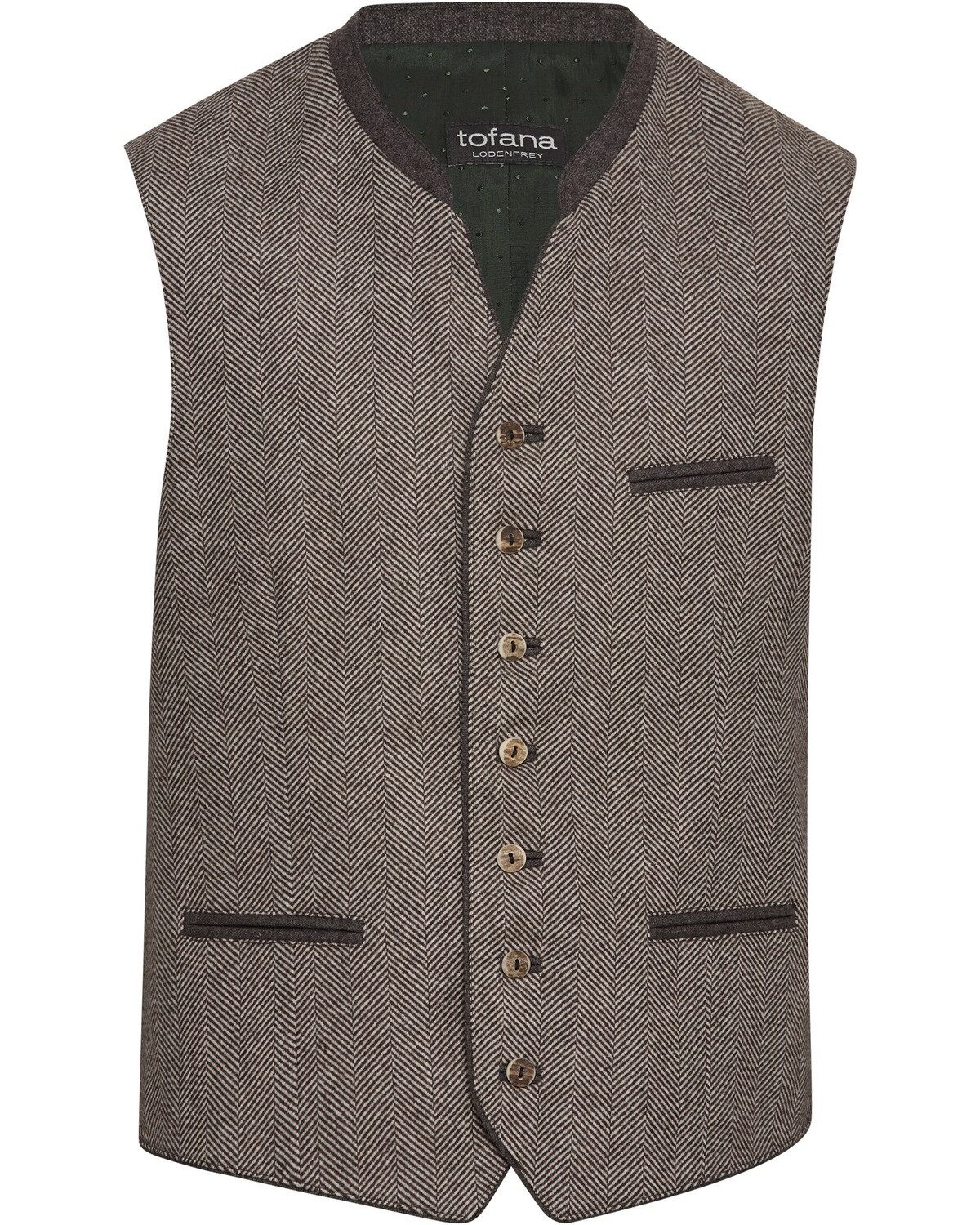 Die regulär geschnittene Herren Weste W.Passau von Lodenfrey verkörpert den klassischen Landhausstil mit einem modernen Twist. Hergestellt aus einer hochwertigen Wollmischung, bietet sie nicht nur ein angenehmes Tragegefühl, sondern auch eine ansprechende Optik. Das feine Fischgrat-Muster verleiht der Weste eine zeitlose Eleganz, die sich ideal für festliche Anlässe oder entspannte Ausflüge in die Natur eignet. Ein markanter Stehkragen sorgt für zusätzlichen Komfort und schützt vor kühlem Wind, während die drei Paspeltaschen praktischen Stauraum für kleine Utensilien bieten. Die durchdachte Gestaltung der Weste verbindet Funktionalität mit stilvollem Design und macht sie zu einem vielseitigen Kleidungsstück für den modebewussten Herren. Der schwarze Rücken mit einem weitenverstellbaren Riegel ermöglicht eine individuelle Anpassung und sorgt für eine perfekte Passform. Ob kombiniert mit einem klassischen Hemd oder lässigen Freizeitlook, die Weste W.Passau ist ein echtes Must-have für jede Garderobe. Sie bringt den rustikalen Charme des Landhausstils in den Alltag und lässt sich mühelos in verschiedene Outfits integrieren. Ein Kleidungsstück, das Tradition und zeitgemäße Eleganz harmonisch vereint und in jeder Situation für einen stilvollen Auftritt sorgt. Oberstoff: 45% Wolle, 25% Polyester, 15% Polyacryl, 10% Polyamid, 5% Sonstige Fasern; Futter: 50% Viskose, 50% Acetat. Dieser Artikel enthält nichttextile Teile tierischen Ursprungs.