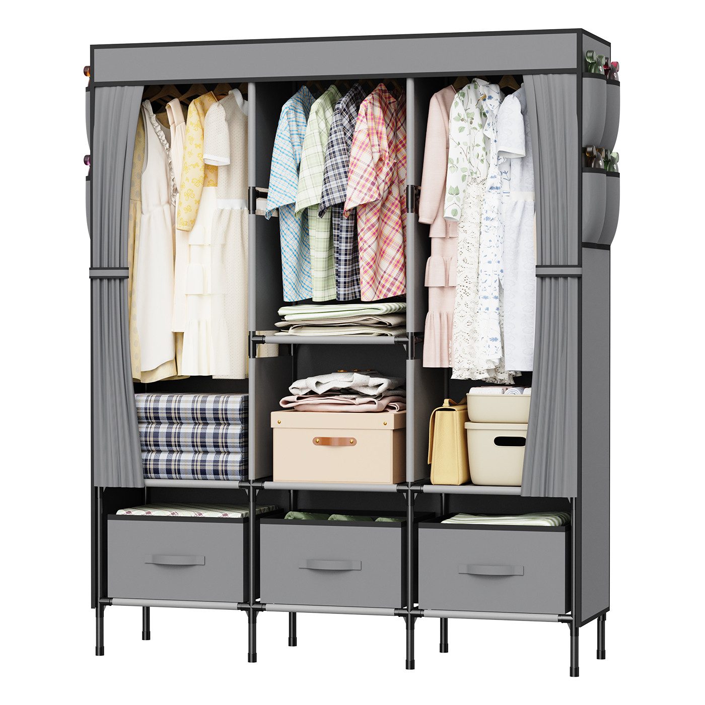 Dieser funktionale Stoffkleiderschrank mit robustem Metallrahmen ist die perfekte Lösung für alle, die zusätzlichen Stauraum benötigen. Mit drei Aufbewahrungsboxen und seitlichen Fächern bietet er nicht nur Platz für Kleidung, sondern hilft auch dabei, kleinere Gegenstände ordentlich zu verstauen. Die konisch geformten Rohrenden erleichtern den Aufbau und erhöhen die Stabilität des Schranks. Dank der praktischen Vorhänge bleibt Ihre Kleidung stets sauber und ordentlich.