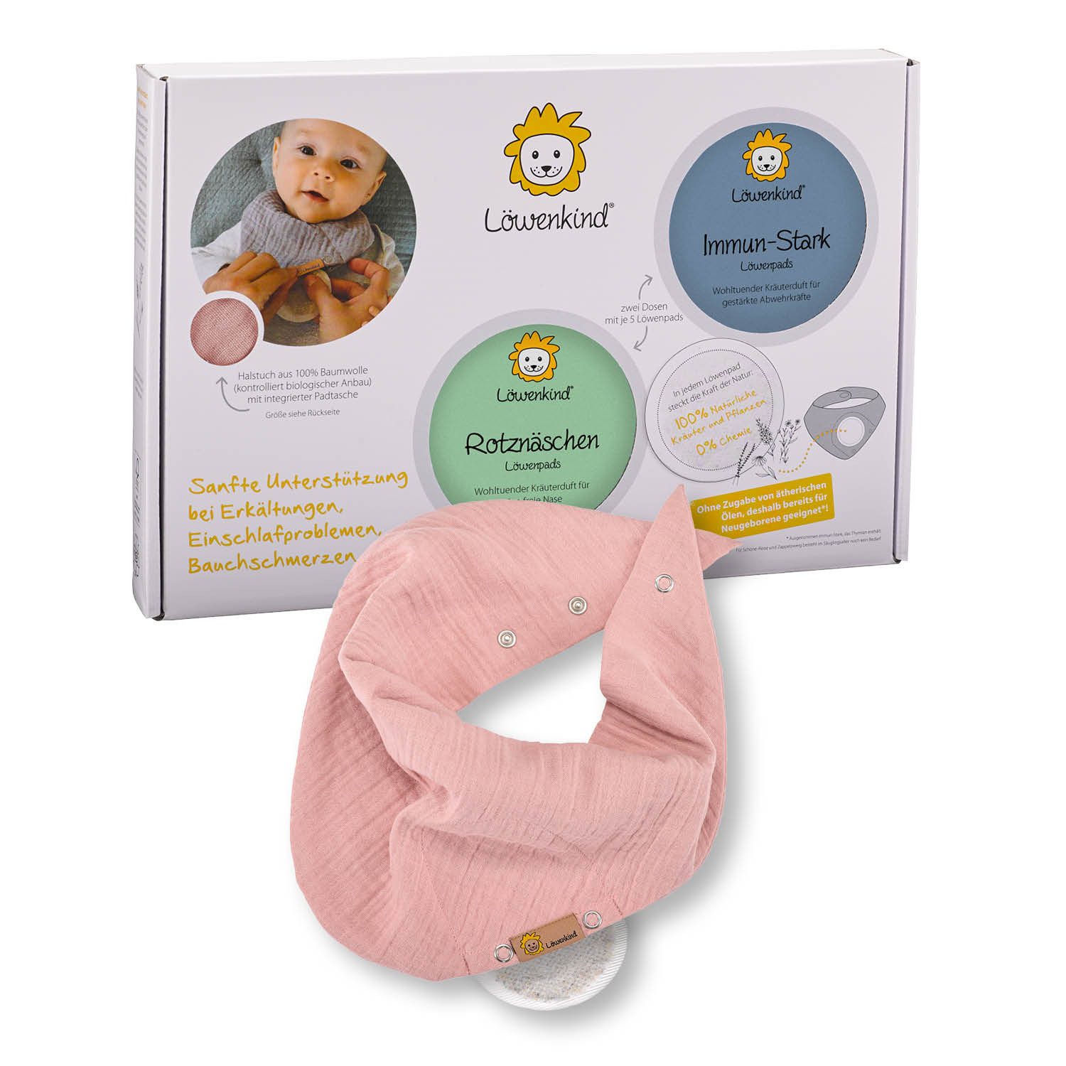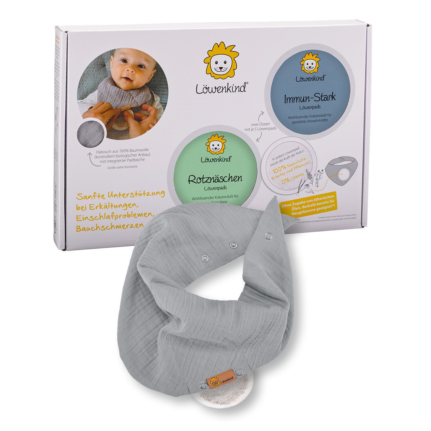"Natürliche Unterstützung einer freien Nase in der Erkältungszeit und Stärkung der Abwehrkräfte. Diese Löwenkind-Einsteigerbox enthält ein Halstuch mit integrierter Pad-Tasche in der Размер „Medi“ sowie je eine Dose mit 5 Pads von Rotznäschen und Immun-Stark. Dieses Musselin-Halstuch ist für Kinder von 4 bis ca. 12 Jahren geeignet und besteht aus hochwertiger Bio-Baumwolle. Das Rotznäschen-Pad beinhaltet Kamillen-, Schlüsselblumen-, Königskerzenblüten und Rosenblütenblätter. Die fein abgestimmte Kräutermischung fördert eine freie Nase und ist ein wohltuender Begleiter in der Erkältungszeit. Das Rotznäschen-Pad fördert auch beim Zahnen auf natürliche Weise eine freie Nase. Im Immun-Stark-Pad sind ausschließlich Olivenblätter, Thymian, Lindenblüten und Ringelblumenblüten enthalten. Diese Kräuterkombination fördert eine gesunde Körperabwehr und unterstützt ein robustes Immunsystem. Ein starkes Löwenpad für starke Kinder (und Erwachsene). Das Immun-Stark-Pad ist für Kinder ab dem 4. Lebensjahr anwendbar."
