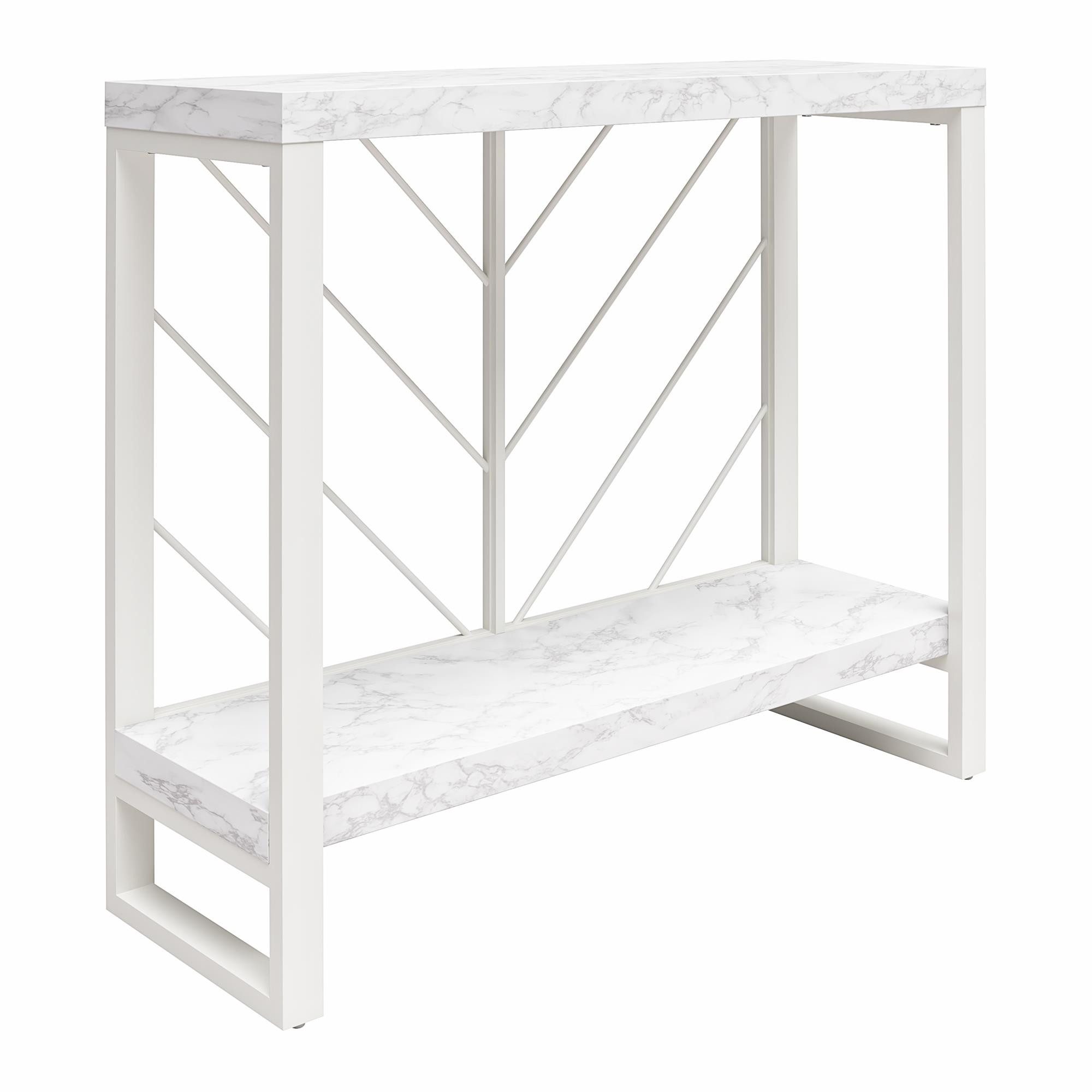 Der Konsolentisch aus robustem MDF und pulverbeschichtetem Metall ist das fehlende Stück in Ihrem Eingangsbereich. Seine Oberfläche aus weißem Kunstmarmor mit hellgrauen Adern strahlt Luxus aus und verbessert die Wahrnehmung des Raums. Er wird in einer einzigen flachen Kiste geliefert und erfordert nur eine minimale Montage, idealerweise durch zwei Erwachsene.