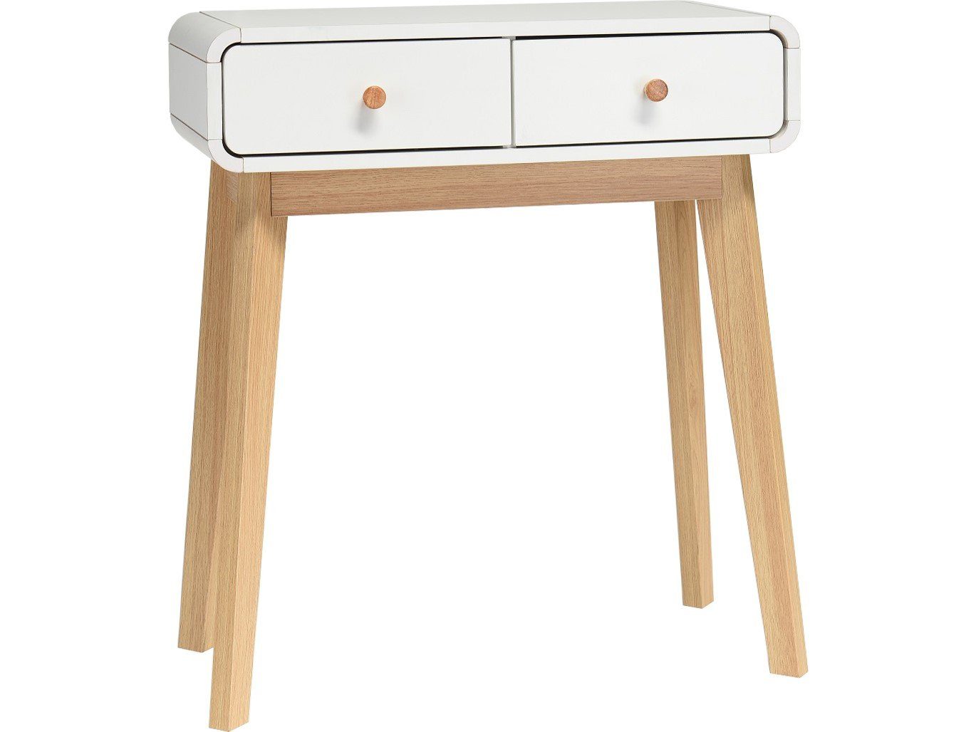 Der kleine Konsolentisch »Caitlin« präsentiert sich im angesagten skandinavischen Wohnstil und überzeugt durch pflegeleichte Oberflächen und eine moderne Optik. Der Korpus verfügt über leicht abgerundete Kanten und ist aus Spanplatte gefertigt. Dank der Folienbeschichtung sind die Oberflächen leicht zu säubern und zudem kratzfest. Das Gestell ist aus MDF mit einer schönen Holzoptik hergestellt und versprüht Wärme und Wohnlichkeit. Mit zwei Schubladen bietet der Konsolentisch Stauraum sowie Ablagefläche und ist zudem vielfältig einsetzbar. Dank des zeitlosen Designs lässt sich die Anrichte mühelos in Ihr Zuhause einfügen und macht garantiert im Eingangsbereich sowie Wohnzimmer eine gute Figur. Entdecken Sie viele weitere, tolle Möbelstücke aus der »Caitlin«-Serie und holen Sie sich ein Stück skandinavischen Wohncharme zu sich nach Hause.