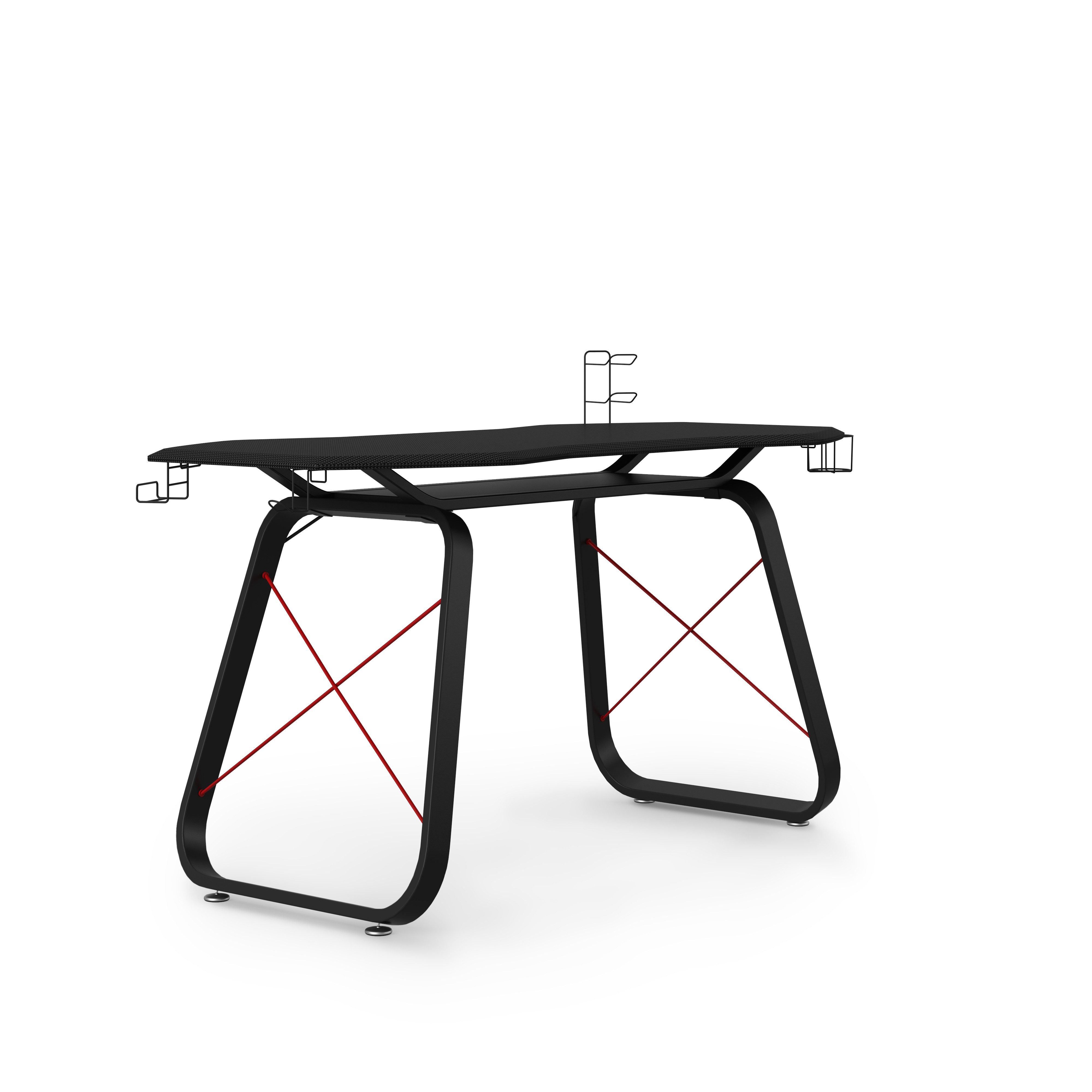 Bringen Sie Ihr Gaming mit diesem Schreibtisch auf die nächste Stufe. Der Stahlrahmen wird durch die roten Querträger perfekt ergänzt, die eine große Arbeitsfläche in Kohlefaseroptik tragen. Gestalten Sie Ihren Gaming-Schreibtisch ganz nach Ihren Bedürfnissen und haben Sie alles immer griffbereit. Inklusive austauschbarer und optionaler Ablagemöglichkeiten: Kopfhöreraufhänger, Server-Rack, Getränkehalter und Ablage für 2 Controller.