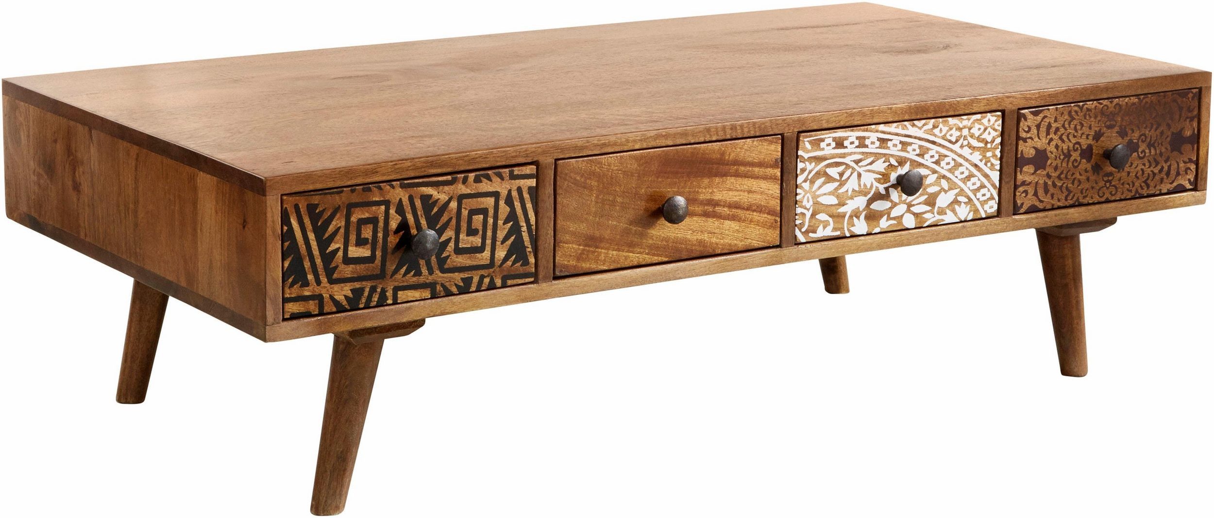 Mit dem Couchtisch zieht ein echtes Highlight in die eigenen vier Wände ein! Das handgefertigte Möbelstück im Vintage-Stil ist ein echtes Schmuckstück und lässt die Herzen aller Einrichtungsbegeisterten höher schlagen! Das verträumte Möbelstück ist mit schön gemusterten Schubladen ausgestattet, die es ermöglichen, Fernbedienungen, Kabel und Co. ordentlich und auer Sichtweite zu verstauen. Kerzen, Vasen und andere dekorative Elemente lassen sich auf dem Tisch wunderbar in Szene setzen. Aus FSC®-zertifiziertem Massivholz gefertigt, zeichnet sich das hübsche Möbelstück zudem durch eine vorbildliche und nachhaltige Waldbewirtschaftung aus. Der Couchtisch ist eine echte Bereicherung für jedes Wohnzimmer!